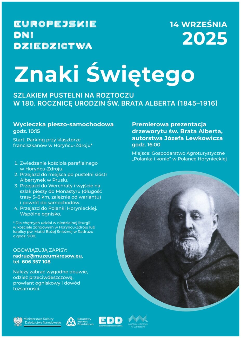 „Bycie dobrym jak chleb” mimo upływu ponad stu lat od śmierci Brata Alberta pozostaje aktualne i bliskie ludziom wrażliwym, empatycznym, otwartym na świat i bliźniego. Muzeum Kresów w Lubaczowie serdecznie zaprasza na premierową prezentację drzeworytu autorstwa rzeźbiarza i twórcy ludowego Józefa Lewkowicza z Nowego Sioła, poświęconego św. Bratu Albertowi (1845–1914). Obowiązują zapisy: Osobiście w Zespole Cerkiewnym w Radrużu, telefonicznie: + 48 606-357-108 lub mailowo: radruz@muzeumkresow.eu, do dnia 12.09.2024 r. do godz. 15.00 (liczba miejsc ograniczona, decyduje kolejność zgłoszeń).