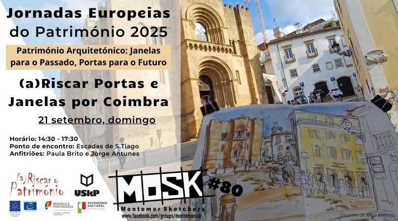 Encontro Urban Sketchers em Coimbra Urban Sketchers são um grupo de pessoas que gosta de desenhar e transporta esse gosto para o seu quotidiano e para a sua vida registando em caderno todos esses momentos. Para mais informação segue os Urban Sketchers Portugal (USkP) são uma associação sem fins lucrativos formada no modelo da Associação Internacional Urban Sketchers. Já o grupo Montemor Sketchers-MoSk trata-se de um grupo regional que realiza encontros no distrito de Coimbra e todos os anos tem participado na iniciativa (a)Riscar o Património promovida pela direção Geral do Parimónio Cultural. Este ano o (a)Riscar o Património, será realizado dentro do âmbito das Jornadas Europeias do Património, entre 18 a 21 de Setembro, subordinadas ao tema “Património Arquitetónico: Janelas para o Passado, Portas para o Futuro” No final do encontro além da foto de grupo é pedido a todos os que participaram que digitalizam e nos enviem os desenhos devidamente identificados para montemor.sketchers@gmail.com Uso de chapéu / proteção solar Calçado confortável Garrafa de Água (0.5lt-1.5lt) Info útil Localização - ponto de encontro (google maps): https://maps.app.goo.gl/wxXZTrK2HqQyovKs8 Os encontros de desenho são abertos para todos, crianças, famílias e seniores. Podem usar qualquer tipo de técnica pois é valorizado cada estilo individual. Vem participar neste encontro e traz o teu material de desenho. (Caderno com capa dura e lápis, caneta, marcadores, aguarelas ou outros)