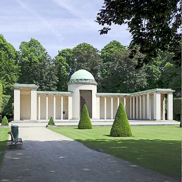 Originally designed by architect Charles Girault, creator of the Cinquantenaire colonnade and the Tervueren Museum, Square du 21 juillet faces Notre-Dame de Laeken church and appears to be an extension of the royal estate. It was King Leopold II who ensured its development. In 1905, the existing slums were demolished and Rue des Vignes widened. In the 1930s, the square underwent a number of modifications, designed by René Pechère, and was endowed with a monument dedicated to Queen Astrid, proposed by architect Paul Bonduelle. Two colonnades converge on a central, open rotunda housing a full-length statue of the sovereign sculpted by Jan Boedts. The sovereign’s cypher, a stylised double A topped by a crown and decorated with ribbons and roses, enhances the coffered ceilings of the U-shaped colonnades. Classicist in style, this monument to monumental academicism illustrates one of the contemporary currents of Art Deco proper. The complex was inaugurated on 21 July 1938 and has retained its name ever since.