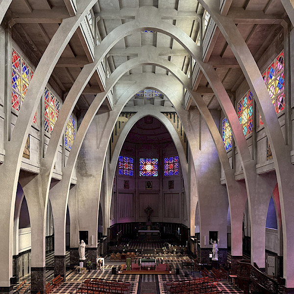 Saint-Jean-Baptiste church is one of three concrete churches in Brussels. It took just 15 months to complete its construction, which began in 1931 under the direction of architect Joseph Diongre. He respected the traditional Latin cross plan, but chose to place the 56 m high bell-tower on the facade. White Brauvilliers stone was used for the exterior cladding, while different types of Belgian marble abound inside the building. Parabolic arches, inspired by the concrete structures of the Orly hangars designed by architect Eugène Freyssinet, lend lightness and spaciousness to the nave, which is beautifully lit by a unique set of brightly coloured stained glass windows. Designed by Diongre but straight from the Brussels workshop of Fernand Crickx, these non-figurative stained-glass windows set in 604 prefabricated openwork panels underwent meticulous restoration in 2004. On sunny days, they create a magical play of light, blending yellow, orange or red with celestial blue. In the nave, between the two levels of bays, mosaics of the twelve apostles, designed by Pierre de Vaucleroy, have been added. (CL 29/02/1984)