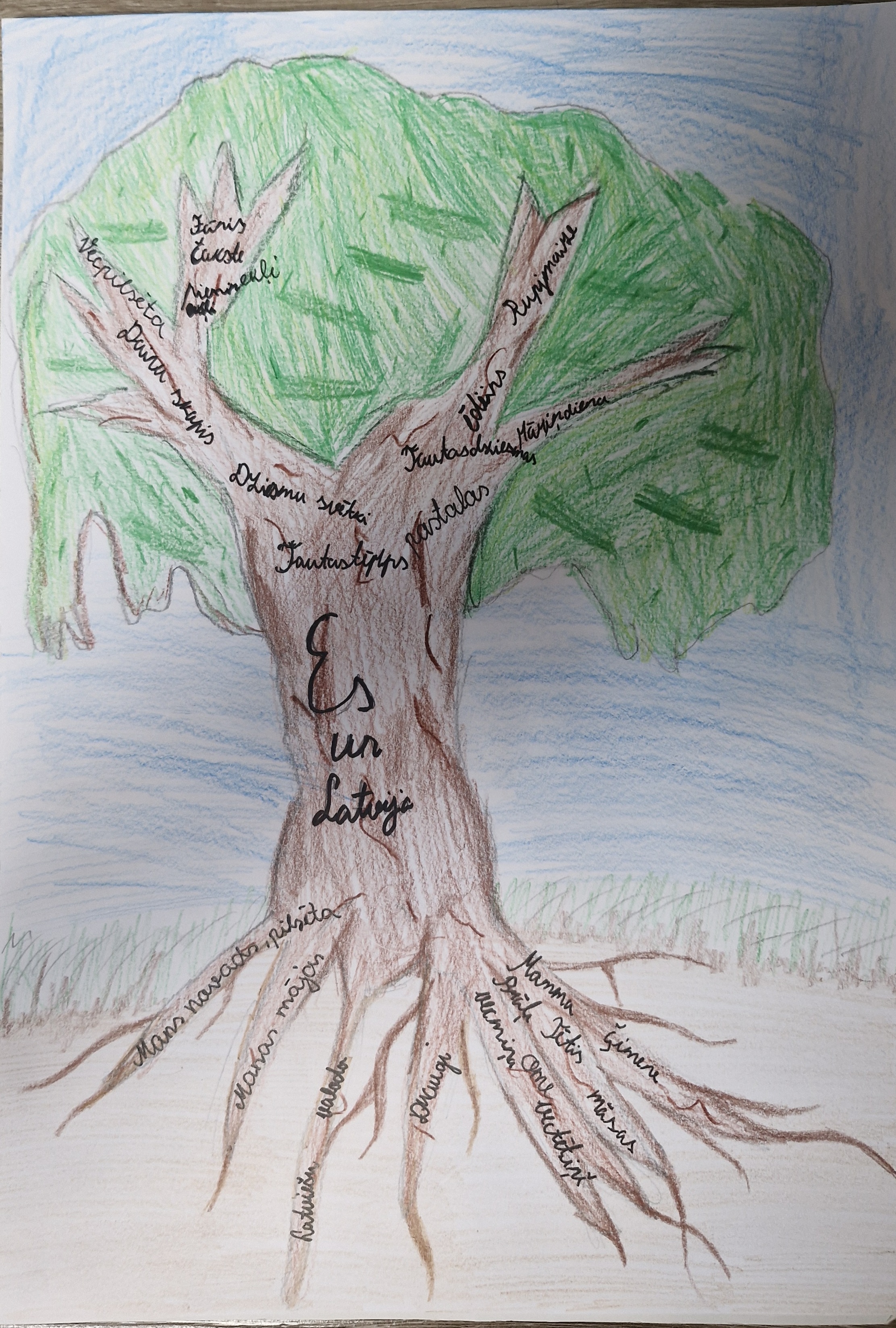 Branches – our traditions and songs. Many branches grow from the trunk. Each branch reminds me of something beautiful and special. One of the branches is the Cabinet of Songs. When I first heard about it, it seemed to me that it was a real cabinet of miracles. It stores many folk songs. There are people's joys and sorrows, love, work, nature and everything else. Another beautiful branch is the Song Festival. When I see people singing there on TV, I feel warm. Thousands of people stand together, everyone sings one song, and it seems that all of Latvia is heard. I dream of singing there someday too. Then I would be a part of them.