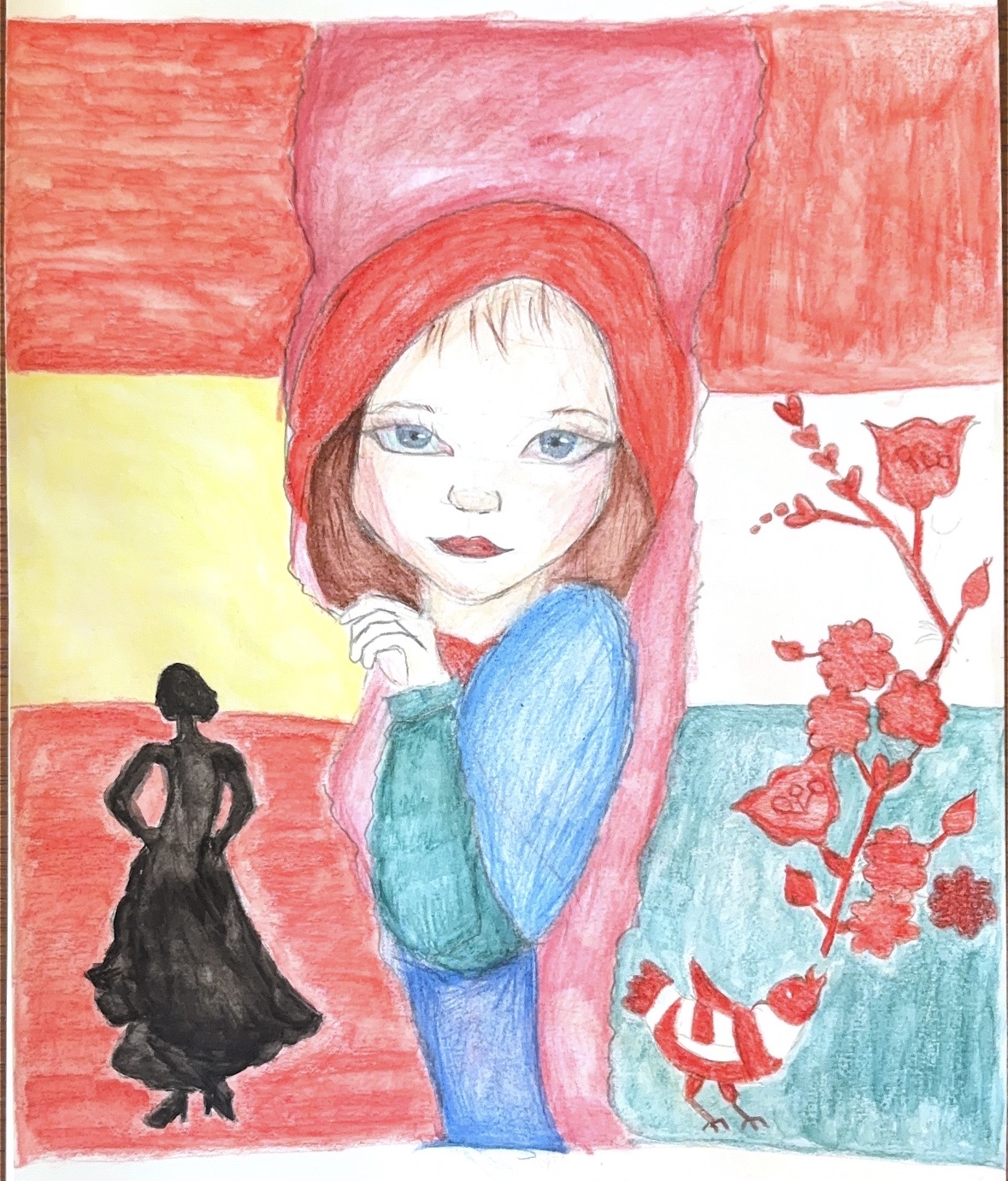 A la derecha dibujé flores y un pajarito húngaros con la bandera húngara, porque me recuerdan a Hungría y a mi familia.