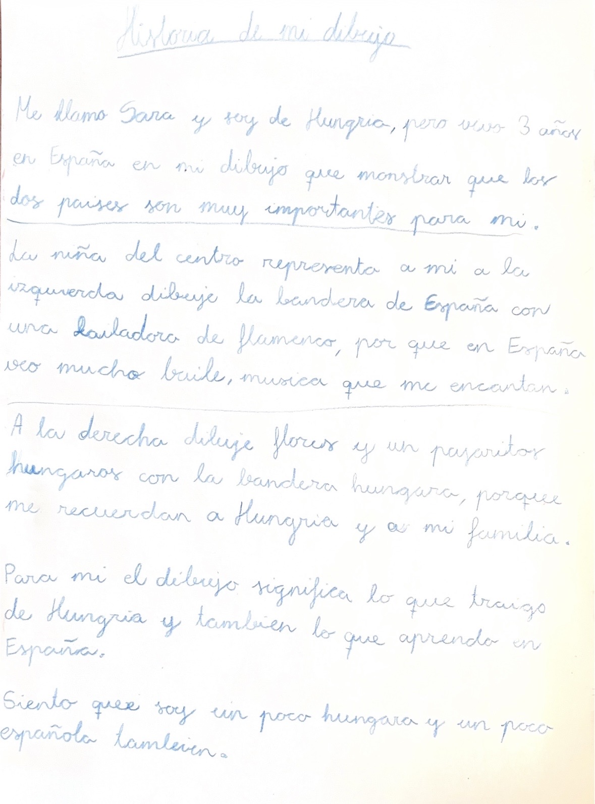 Me llamo Sara y soy de Hungría, pero vivo 3 años en España. En mi dibujo quiero que monstrar que los dos países son muy importantes para mi.