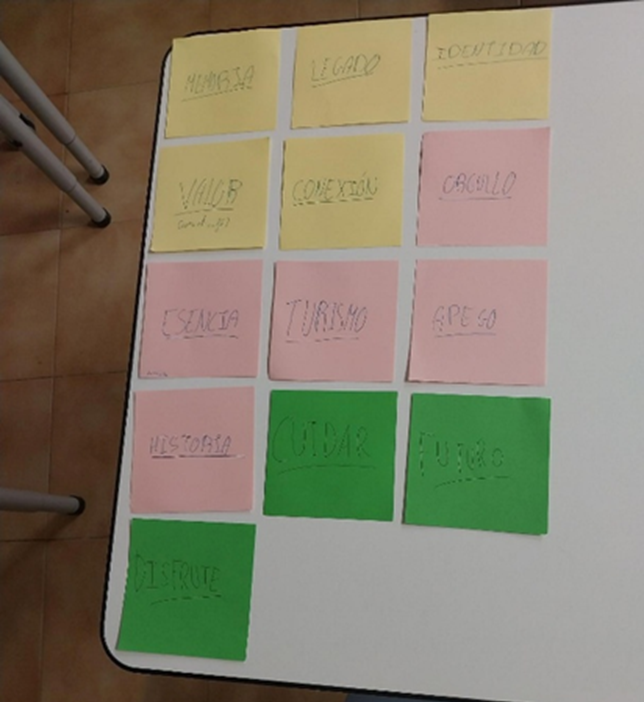 En una primera sesión leímos las bases del concurso y decidimos realizar un vídeo. Después, intentamos definir qué es el patrimonio para nosotros, dándonos cuenta de que englobar tantas cosas en un mismo concepto nos resultaba difícil. Con una dinámica de posits, establecimos palabras claves que queríamos que salieran en nuestro proyecto. Hicimos lo mismo con la idea de cómo debemos cuidar nuestro patrimonio, motivados por varias noticias que hacían referencia a vandalismo para crear conciencia.