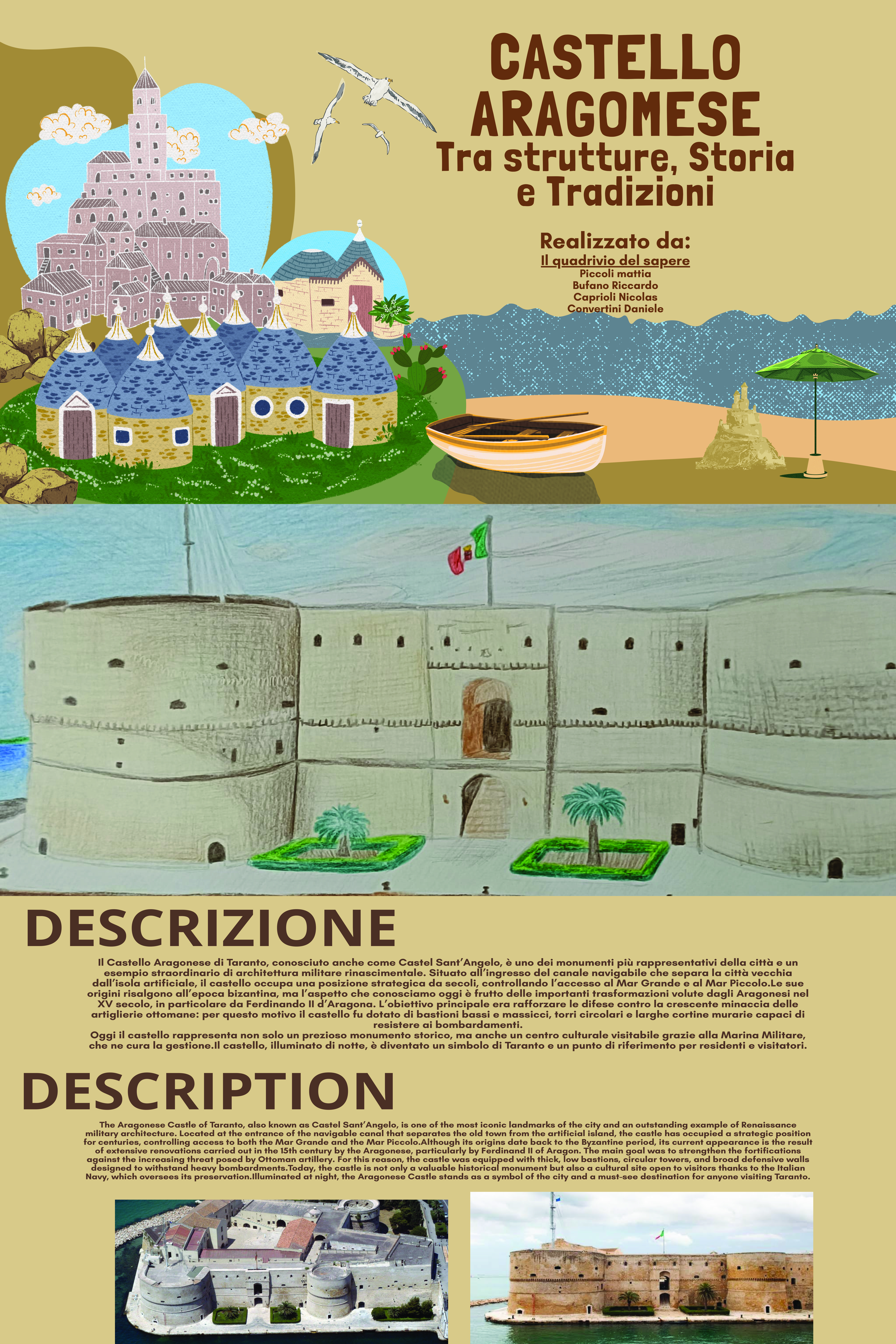 The Aragonese Castle of Taranto, also know as a Castel Sant’Angelo, is one of the most iconic landmarks of the city and an outstanding example of Renaissance military architecture. Located at the entrance of the navigable canal that separates the old town from the artificial island, the castle has occupied a strategic position for centuries, controlling access to both the Mar Grande and the Mar Piccolo.Although its origins date back to the Byzantine period, its current appearance is the result of extensive renovations carried out in the 15th century by the Aragonese, particularly by Ferdinand II of Aragon. The main goal was to strengthen the fortifications against the increasing threat posed by Ottoman artillery. For this reason, the castle was equipped with thick, low bastions, circular towers, and broad defensive walls designed to withstand heavy bombardments.Today, the castle is not only a valuable historical monument but also a cultural site open to visitors thanks to the Italian Navy, which oversees its preservation.Illuminated at night, the Aragonese Castle stands as a symbol of the city and a must-see destination for anyone visiting Taranto.