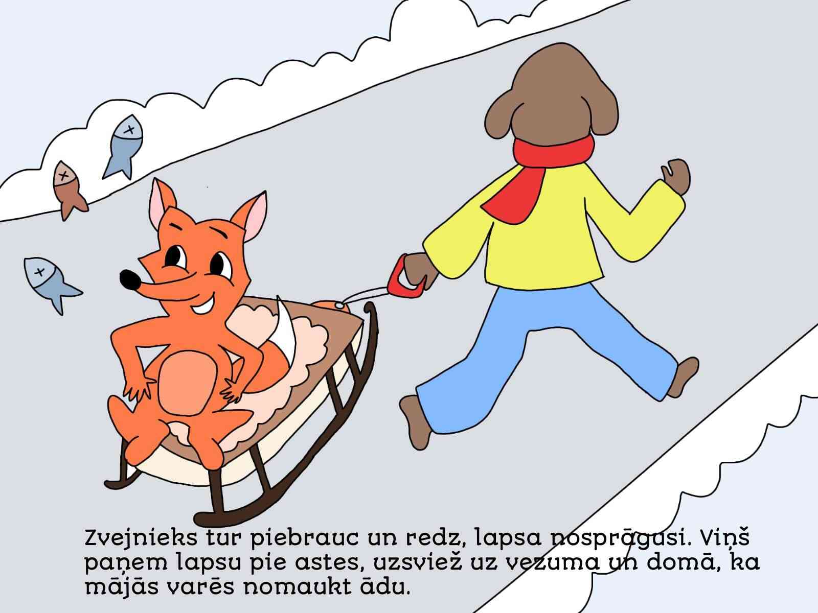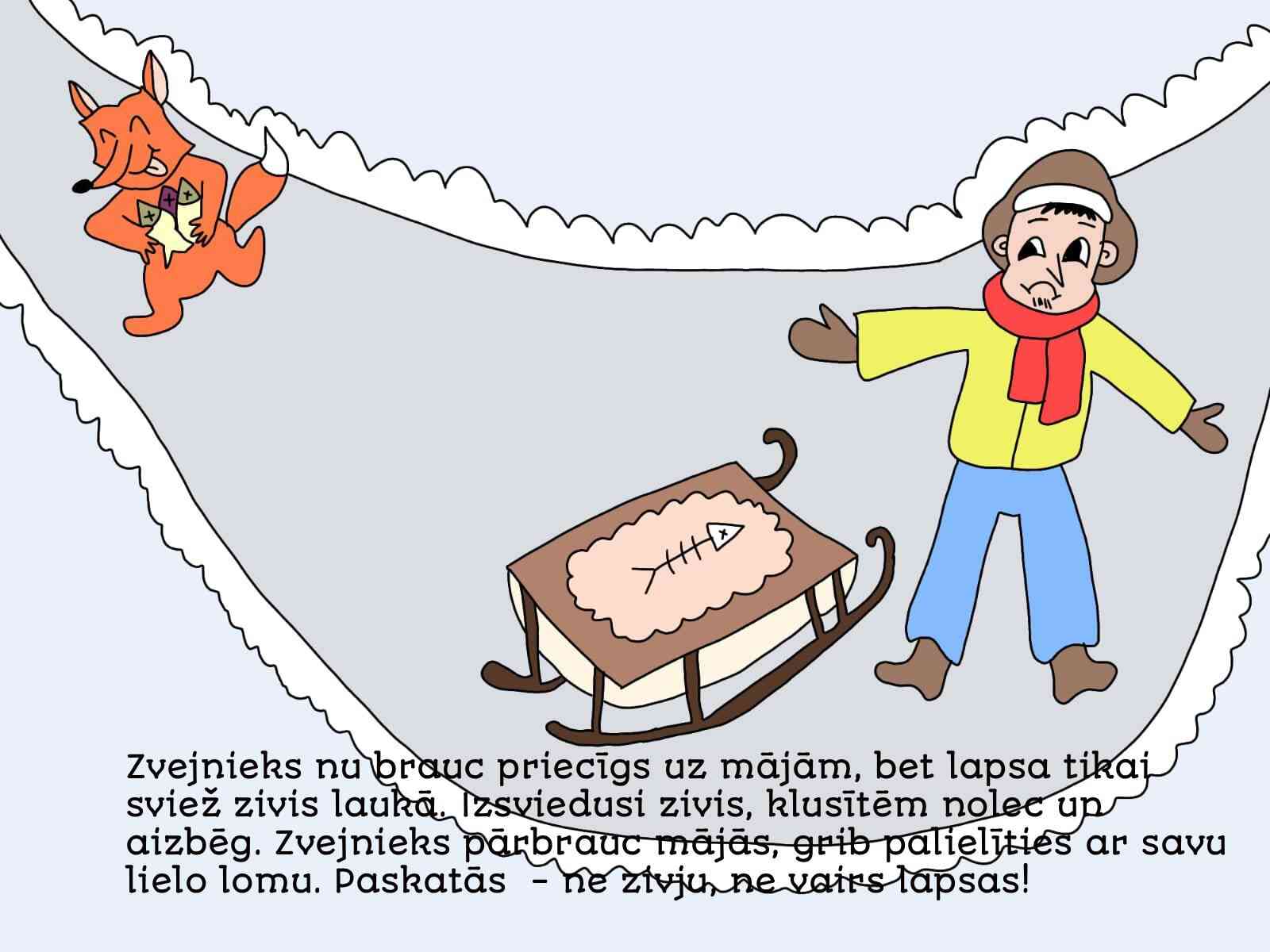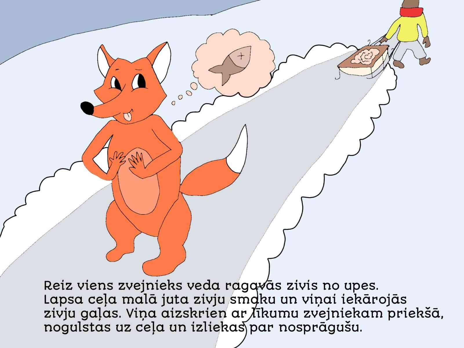 LV: Pasaku izvēlējos, jo tā ir gan smieklīga, gan pamācoša – viltīgā lapsa apmāna zvejnieku, atgādinot, ka jābūt uzmanīgiem pret viltībām. Darba gaitā uzzinu arī par seno zvejniecību un sapratu, ka šī pasaka ir daļa no Latvijas vēstures un kultūras mantojuma. Domājot par konkursa jautājumu, nonācu pie atziņas, ka kultūras mantojums ir mūsu tautas atmiņa – stāsti, dziesmas un tradīcijas, no kurām varam mācīties. Man šķita īpaši aizraujoši seno pasaku attēlot mūsdienīgās ilustrācijās un turpināt stāstu jaunā veidā. Strādājot pie zīmējumiem, centos izcelt lapsas viltību un amizantumu, kā arī zvejnieka laipnību un apjukumu, kad viņš nonāk lapsas lamatās.