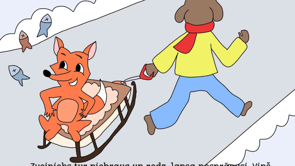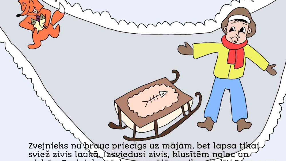 ENG: I chose the fairy tale because it is both funny and instructive – the cunning fox tricks the fisherman, reminding me to be careful of tricks. During my work, I also learned about ancient fishing and realized that this fairy tale is part of the history and cultural heritage of Latvia. Thinking about the competition question, I came to the conclusion that cultural heritage is the memory of our people – stories, songs and traditions from which we can learn. I found it particularly exciting to depict an ancient fairy tale in modern illustrations and continue the story in a new way. While working on the drawings, I tried to highlight the cunning and amusingness of the fox, as well as the kindness and confusion of the fisherman when he falls into the fox’s trap.