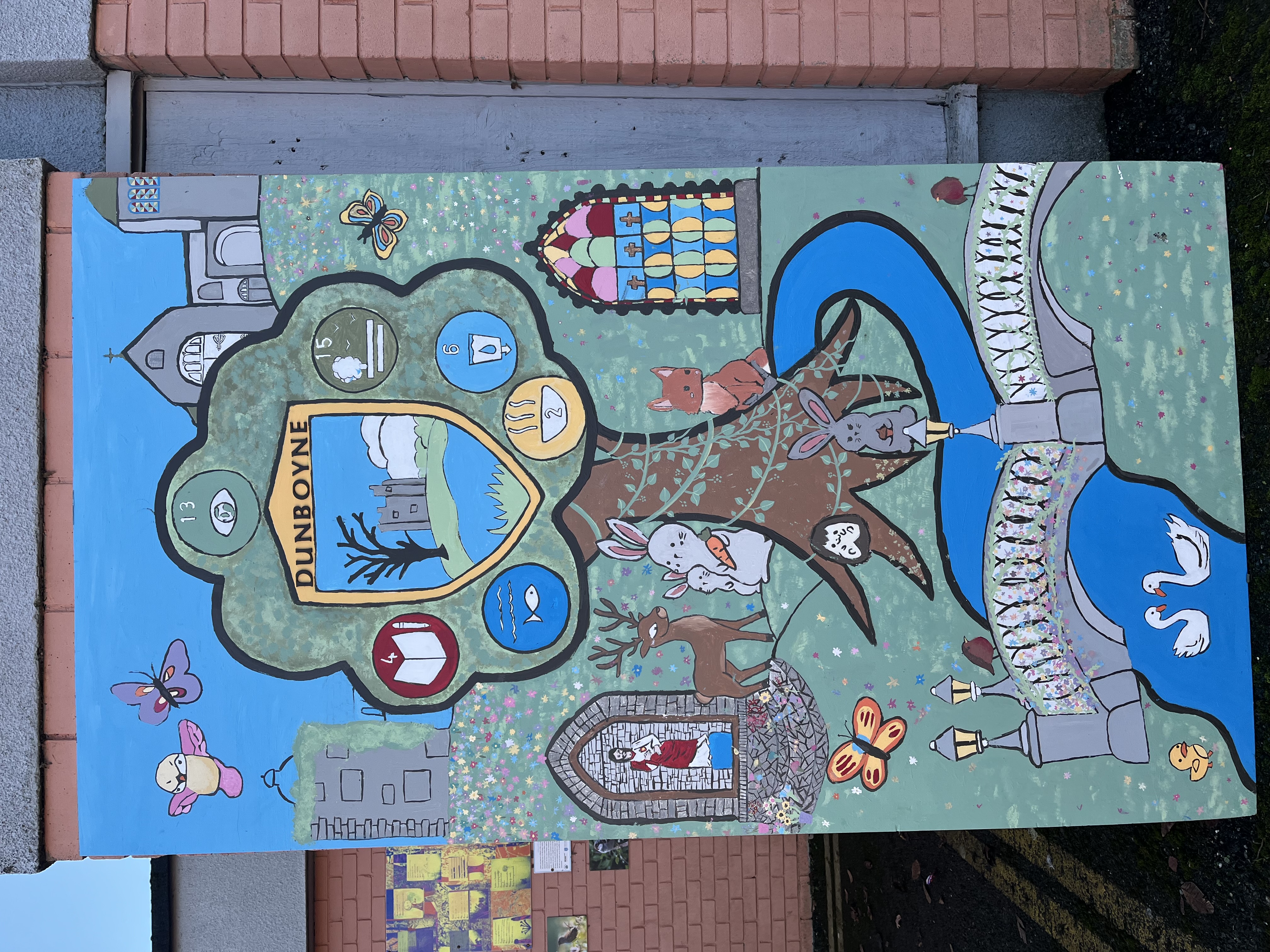 Our heritage mural is a celebration of Dunboyne — its people, its stories, its places, its nature, and its future. When we started this project, we wanted to understand what heritage really means. We learned that heritage is not only about old buildings or events from the past. It is also about our environment, our families, our community, and the things we want to protect for the future. As part of this learning, we take part in the Heritage in Schools Programme, Green Schools Programme, GLOBE Programme, Biodiversity in Schools Nature Hero Awards and the Irish Aid Programme, as well as G.I.Y Grow Your Own, Incredible Edibles, Rivers as Ecosystems, and the Trinity College NCAD Lichen Mural Project. We also held an Action Day in our local GAA Club where we planted over 500 spring bulbs. All of these projects show our ongoing commitment to protecting, understanding, and celebrating the natural heritage around us. Our mural is a way for us to show what Dunboyne means to us and how we want it to be for the generations that will come after us.