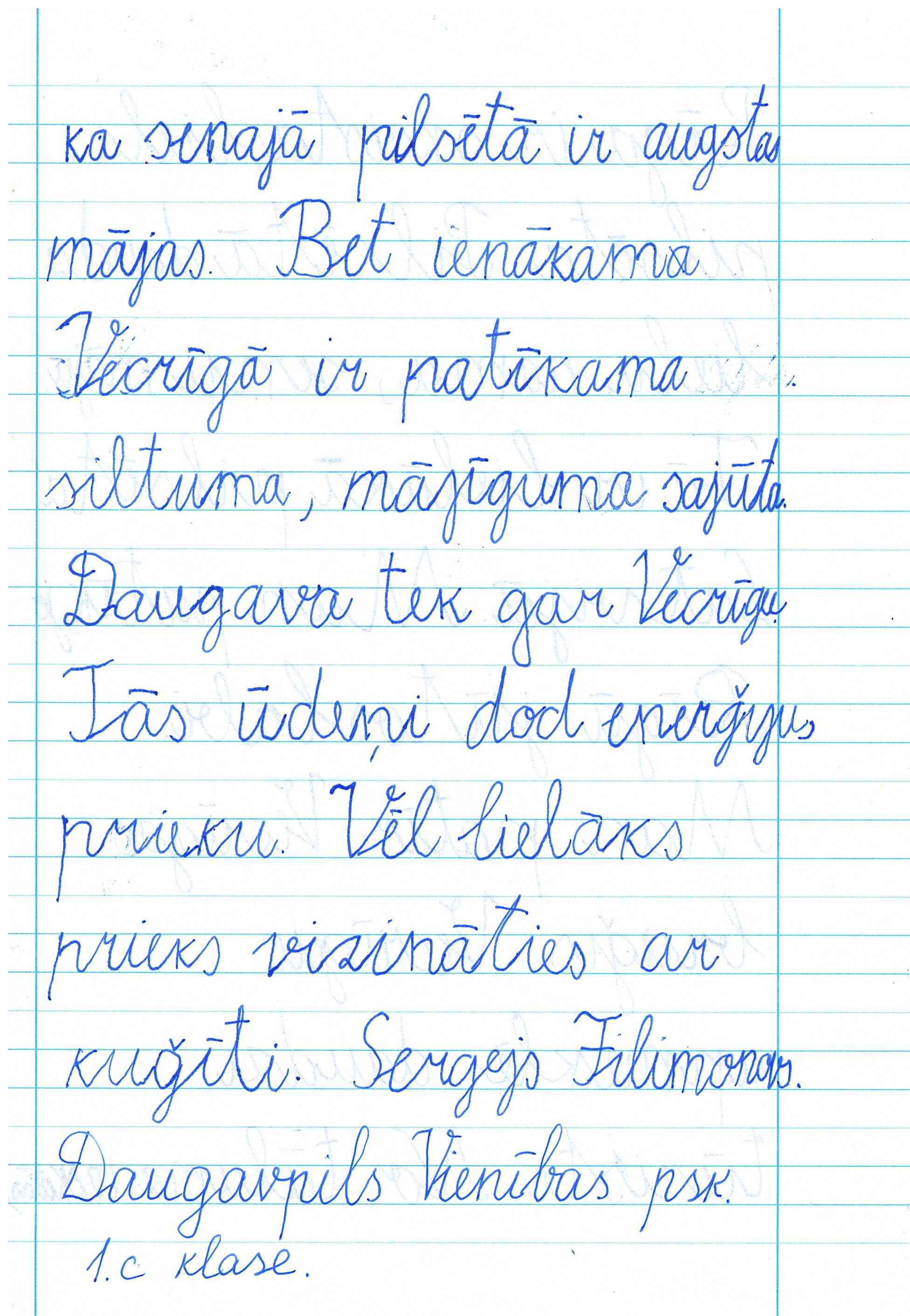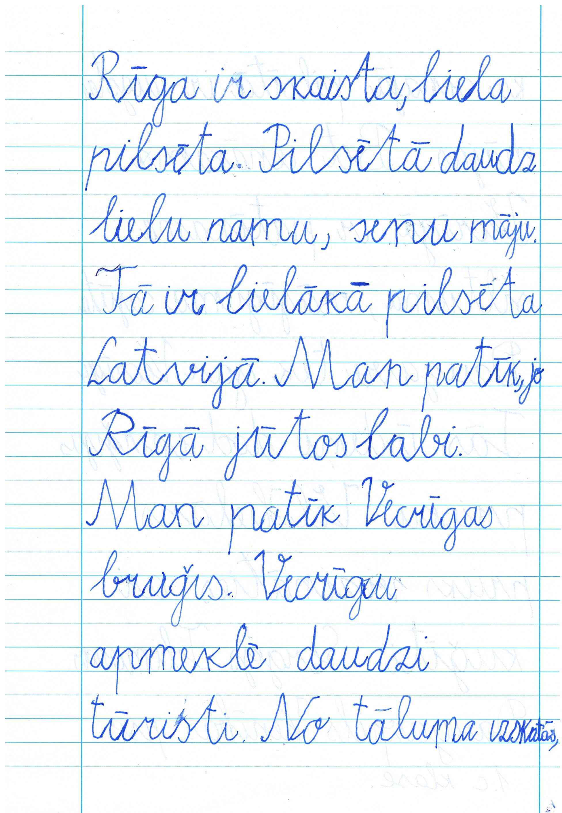 LV: Rīga ir skaista, liela pilsēta. Pilsētā daudz lielu namu, senu māju. Tā ir lielākā pilsēta Latvijā. Man patīk, jo Rīgā jūtos labi. Man patīk Vecrīgas bruģis. Vecrīgu apmeklē daudzi tūristi. No tāluma izskatās, ka senajā pilsētā ir augstas mājas. Bet ienākot Vecrīgā ir patīkama siltuma, mājīguma sajūta. Daugava tek gar Vecrīgu. Tās ūdeņi dod enerģiju, prieku. Vēl lielāks prieks vizināties ar kuģīti.