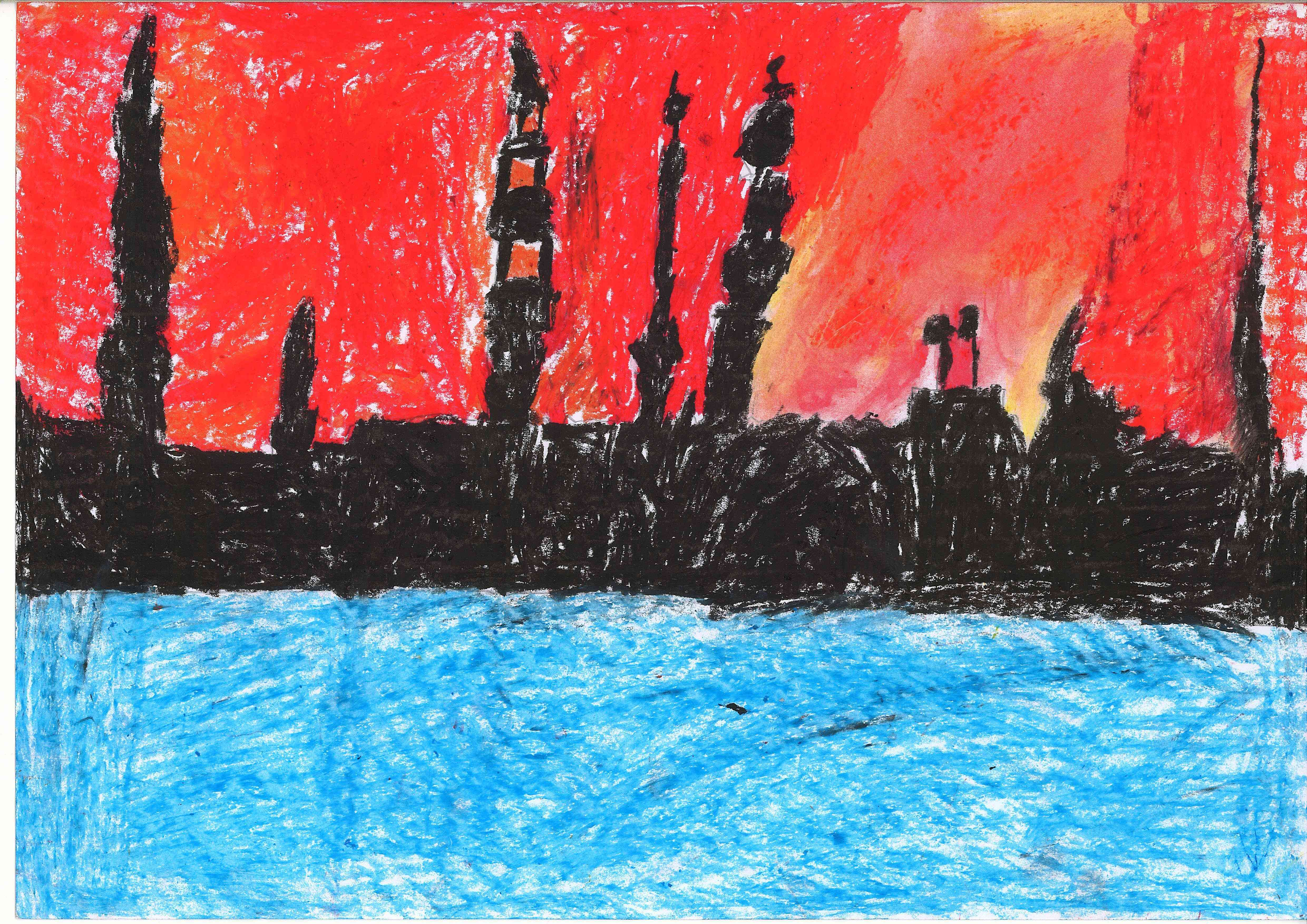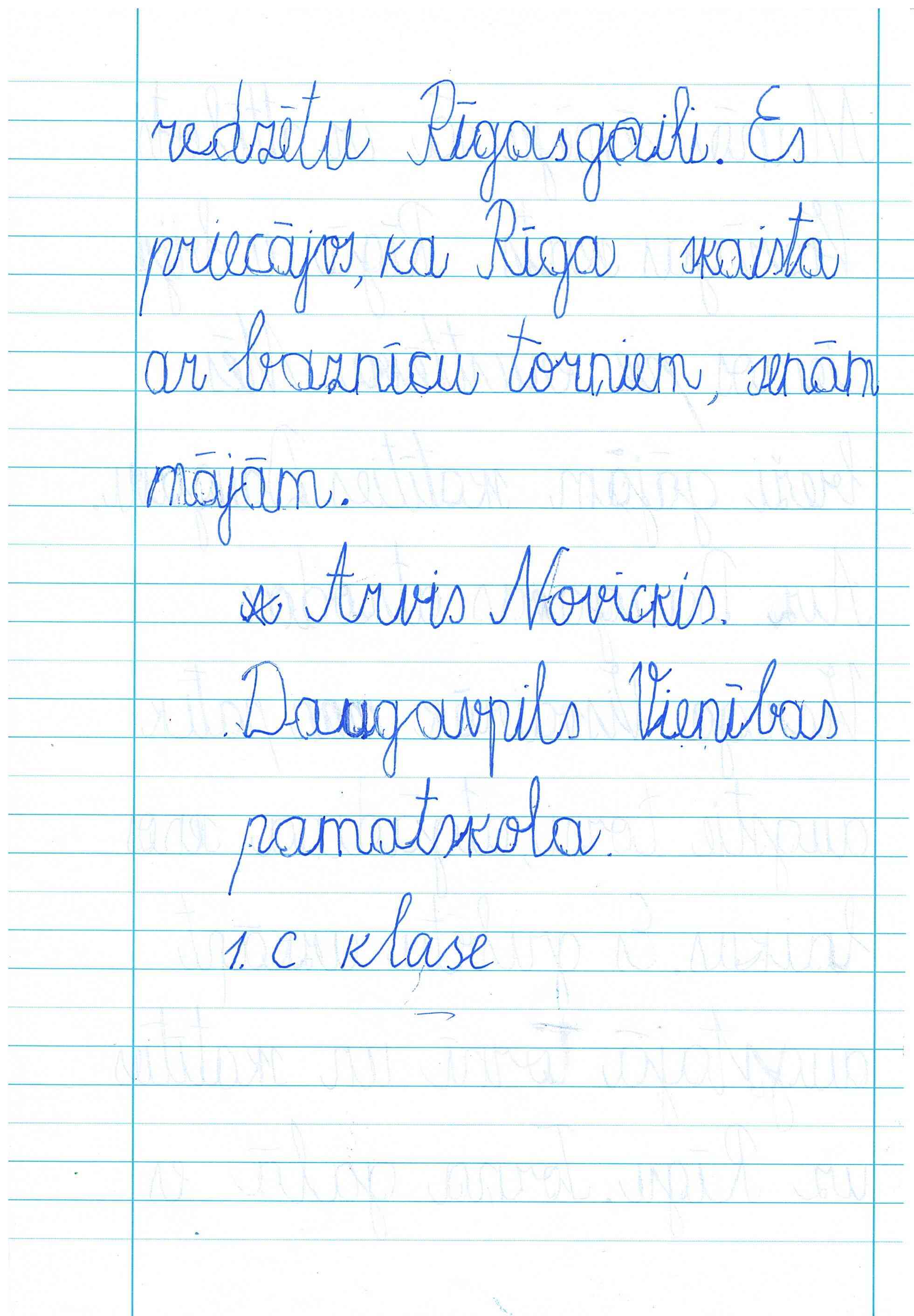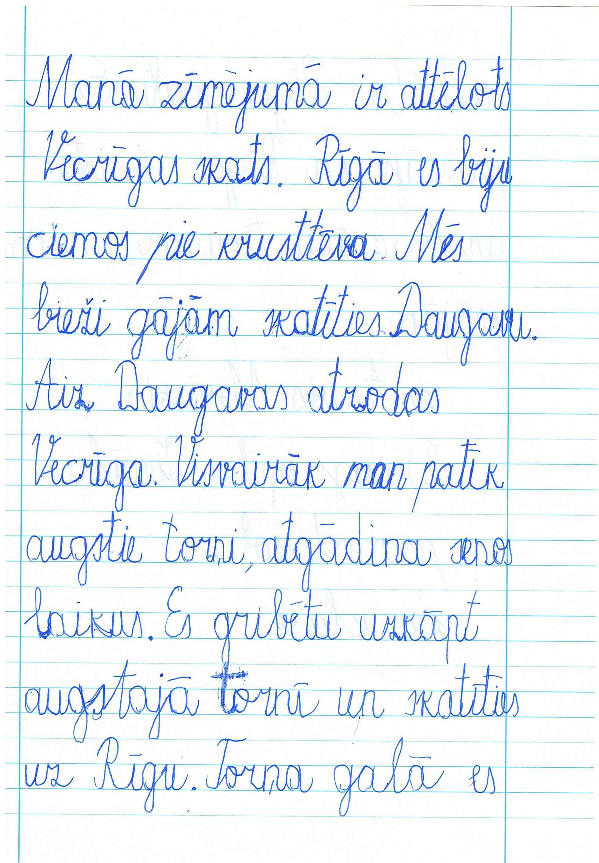 LV: Manā zīmējumā ir attēlots Vecrīgas skats. Rīgā es biju ciemos pie krusttēva. Mēs bieži gājām skatīties Daugavu. Aiz Daugavas atrodas Vecrīga. Visvairāk man patīk augstie torņi, kas atgādina senos laikus. Es gribētu uzkāpt augstākajā tornī un skatīties uz Rīgu. Torņa galā es redzētu Rīgas gaili. Es priecājos, ka Rīga skaista ar baznīcu torņiem un senām mājām.