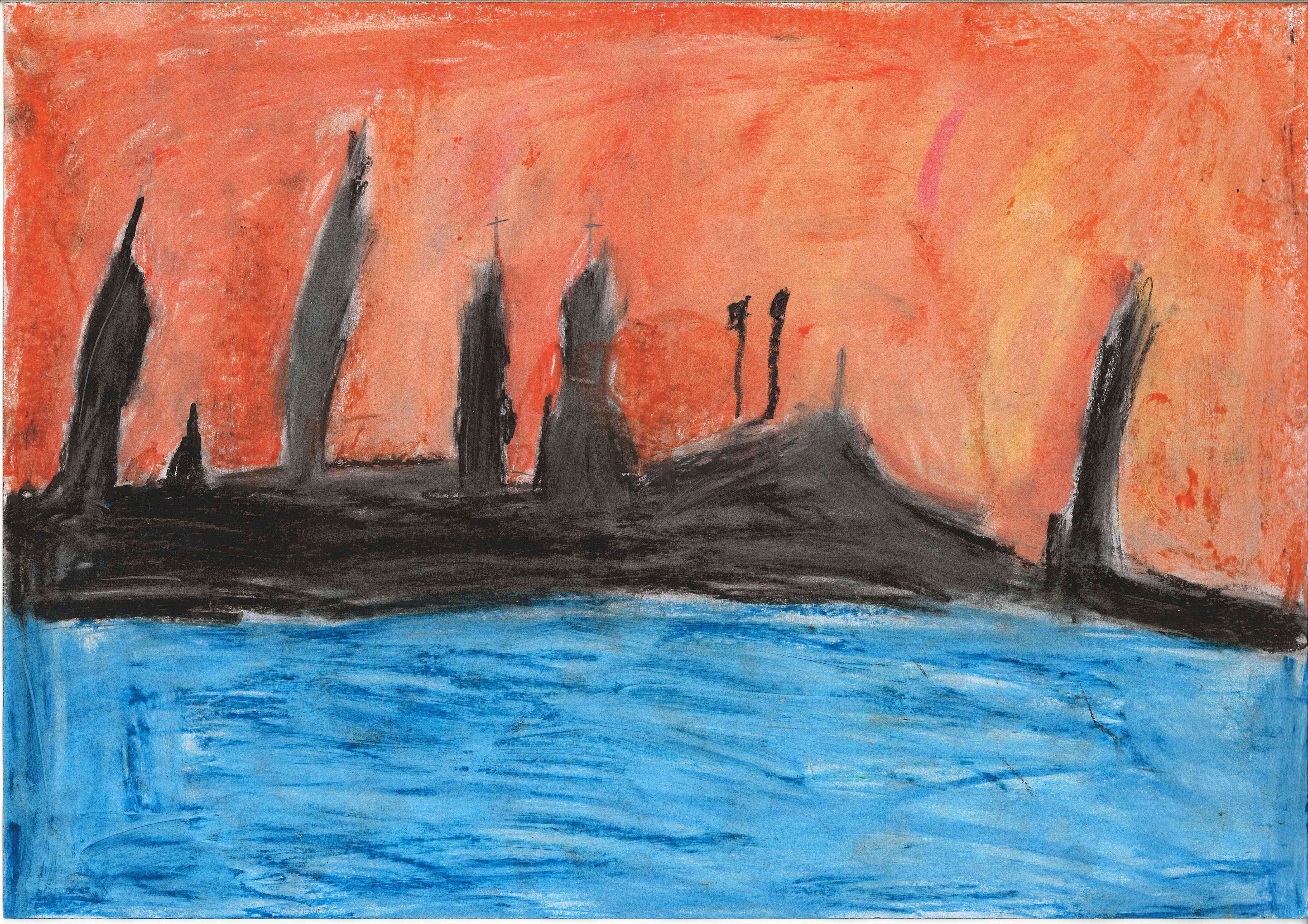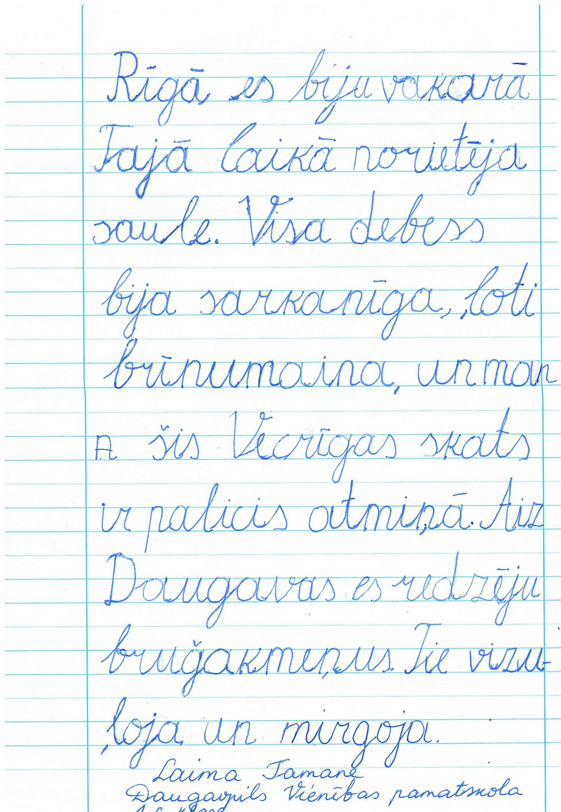 LV: Rīgā es biju vakarā. Tajā laikā norietēja saule. Visa debess bija sarkanīga, ļoti brīnumaina, un man šis Vecrīgas skats ir palicis atmiņā. Aiz Daugavas es redzēju bruģakmeņus. Tie vizuļoja un mirgoja.