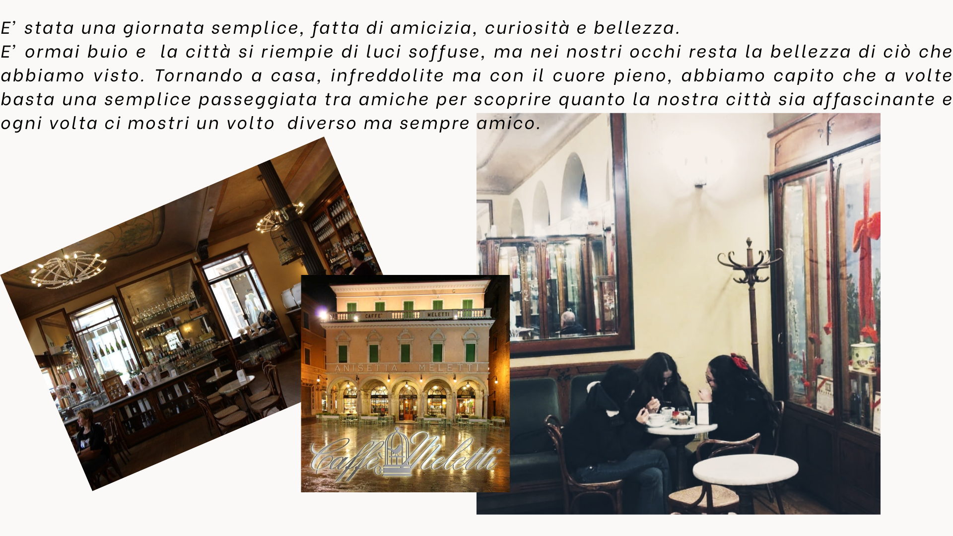 E’ ormai buio e  la città si riempie di luci soffuse, ma nei nostri occhi resta la bellezza di ciò che abbiamo visto. Tornando a casa, infreddolite ma con il cuore pieno, abbiamo capito che a volte basta una semplice passeggiata tra amiche per scoprire quanto la nostra città sia affascinante e ogni volta ci mostri un volto  diverso ma sempre amico.