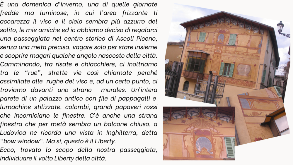 È una domenica d'inverno, una di quelle giornate fredde ma luminose, in cui l'area frizzante ti accarezza il viso e il cielo sembra più azzurro del solito, le mie amiche ed io abbiamo deciso di regalarci una passeggiata nel centro storico di Ascoli Piceno, senza una meta precisa, vagare solo per stare insieme e scoprire magari qualche angolo nascosto della città. Camminando, tra risate e chiacchiere, ci inoltriamo tra le “rue”, strette vie così chiamate perché assimilate alle  rughe del viso e, ad un certo punto, ci troviamo davanti uno strano  murales. Un’intera parete di un palazzo antico con file di pappagalli e  lumachine stilizzate, colombi, grandi papaveri rossi che incorniciano le finestre. C’è anche una strana finestra che per metà sembra un balcone chiuso, a Ludovica ne ricorda una vista in Inghilterra, detta “bow window". Ma si, questo è il Liberty.