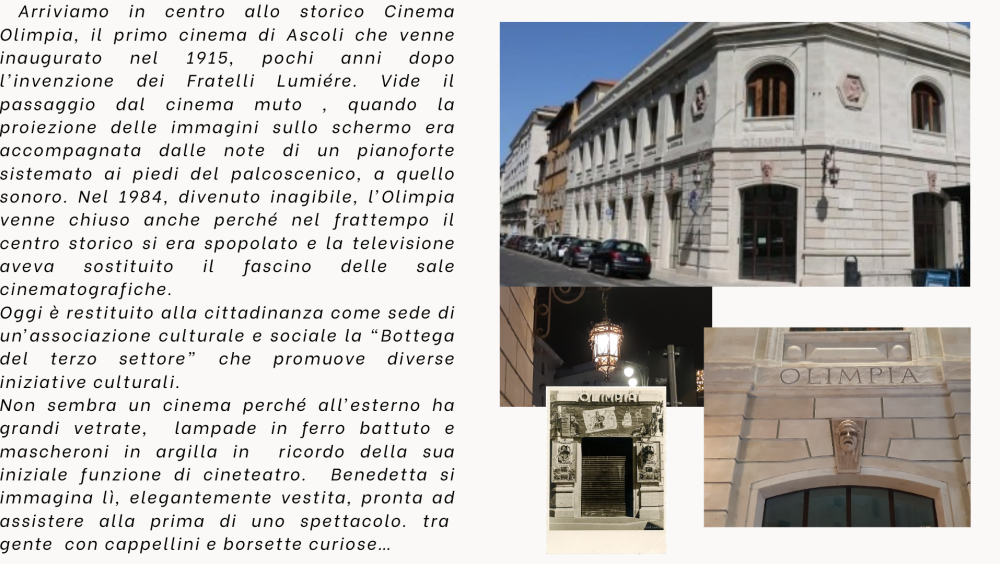Non sembra un cinema perché all’esterno ha grandi vetrate,  lampade in ferro battuto e mascheroni in argilla in  ricordo della sua iniziale funzione di cineteatro.  Benedetta si immagina lì, elegantemente vestita, pronta ad assistere alla prima di uno spettacolo. tra  gente  con cappellini e borsette curiose…