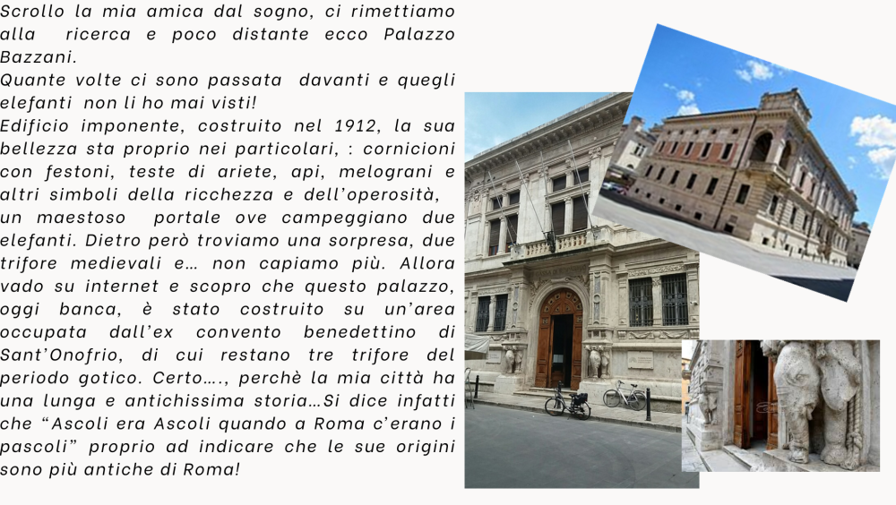 Edificio imponente, costruito nel 1912, la sua bellezza sta proprio nei particolari, : cornicioni con festoni,teste di ariete, api, melograni e altri simboli della ricchezza e dell'operosità,   un maestoso  portale ove campeggiano due elefanti. Dietro però troviamo una sorpresa, due trifore medievali e… non capiamo più. Allora vado su internet e scopro che questo palazzo, oggi banca, è stato costruito su un'area occupata dall'ex convento benedettino di Sant'Onofrio, di cui restano tre trifore del periodo gotico. Certo…., perchè la mia città ha una lunga e antichissima storia…Si dice infatti che “Ascoli era Ascoli quando a Roma c’erano i pascoli” proprio ad indicare che le sue origini sono più antiche di Roma!