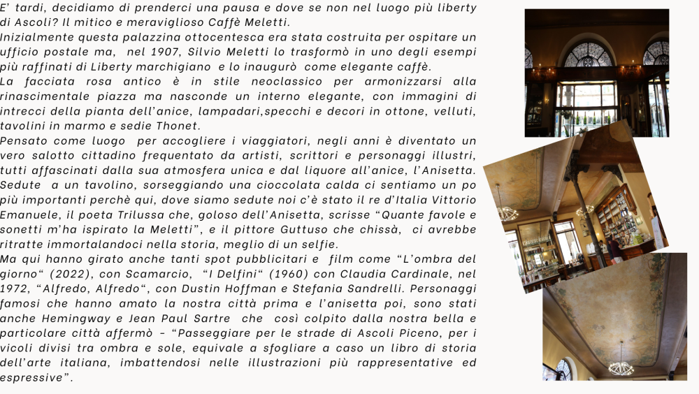 E’ tardi, decidiamo di prenderci una pausa e dove se non nel luogo più liberty di Ascoli? Il mitico e meraviglioso Caffè Meletti.