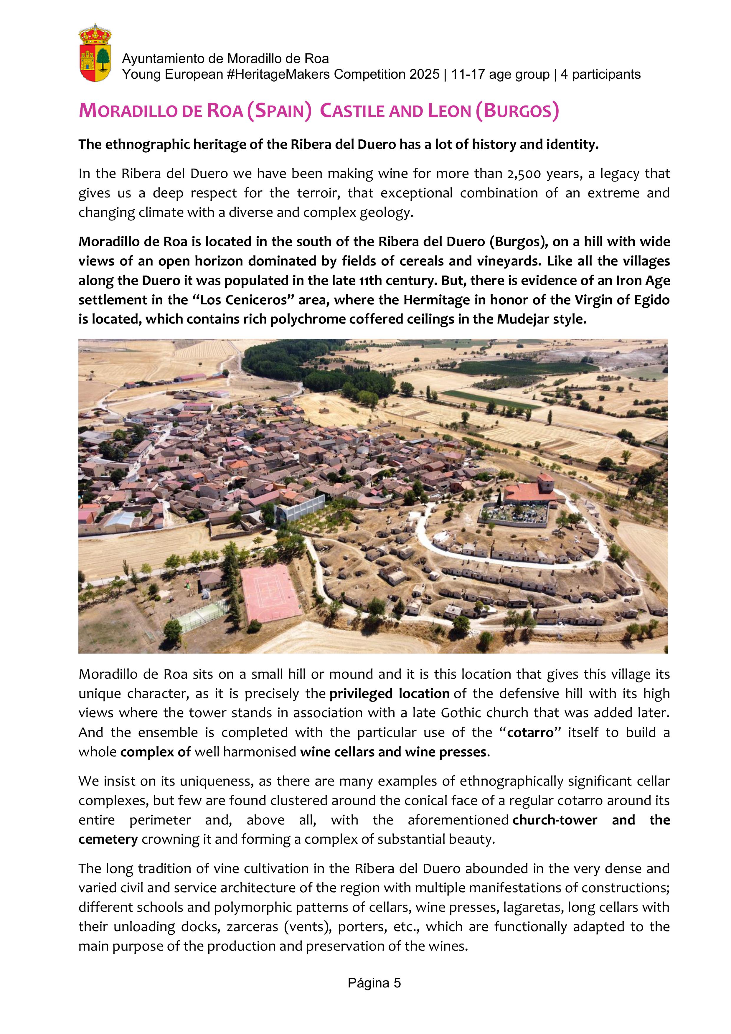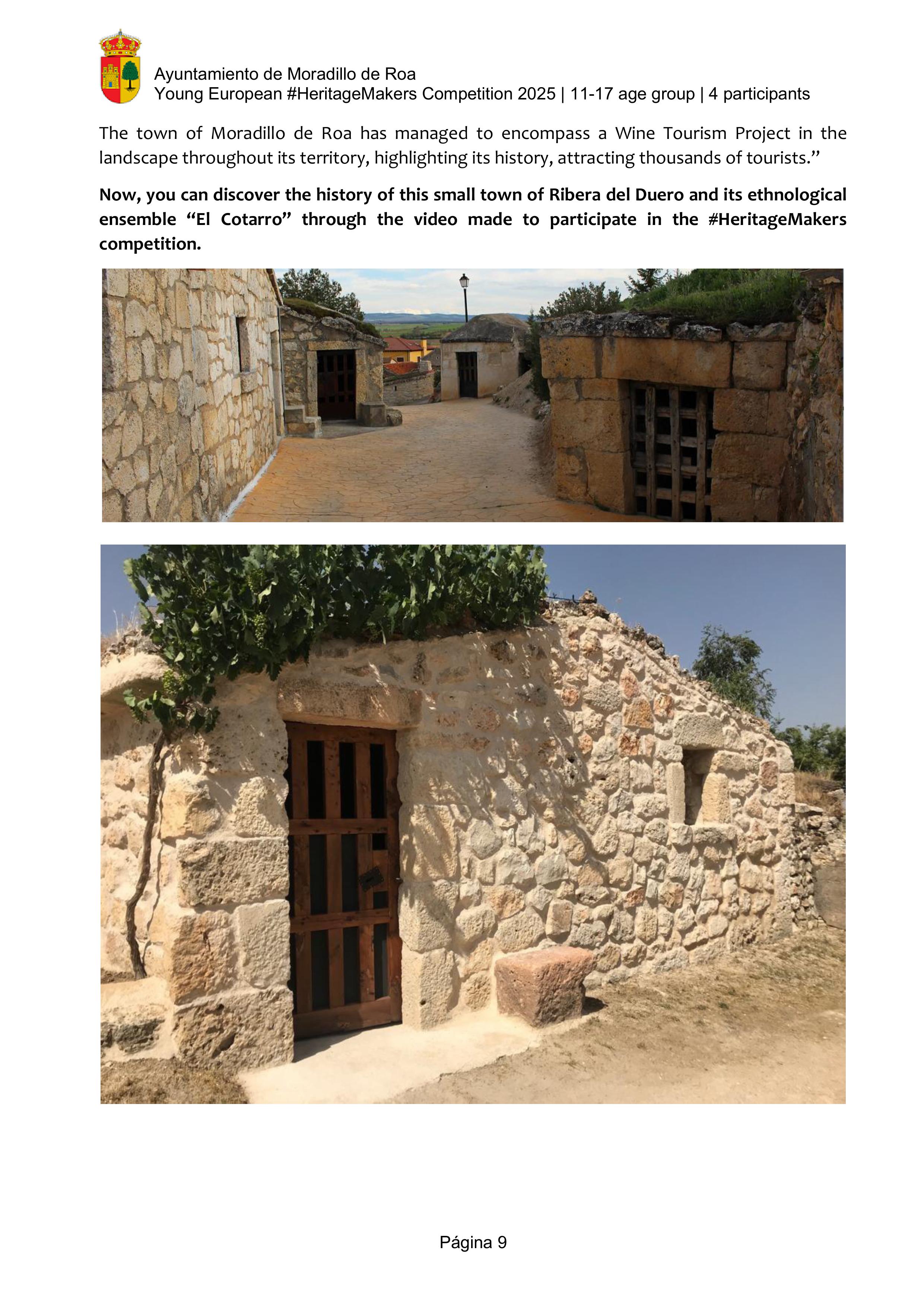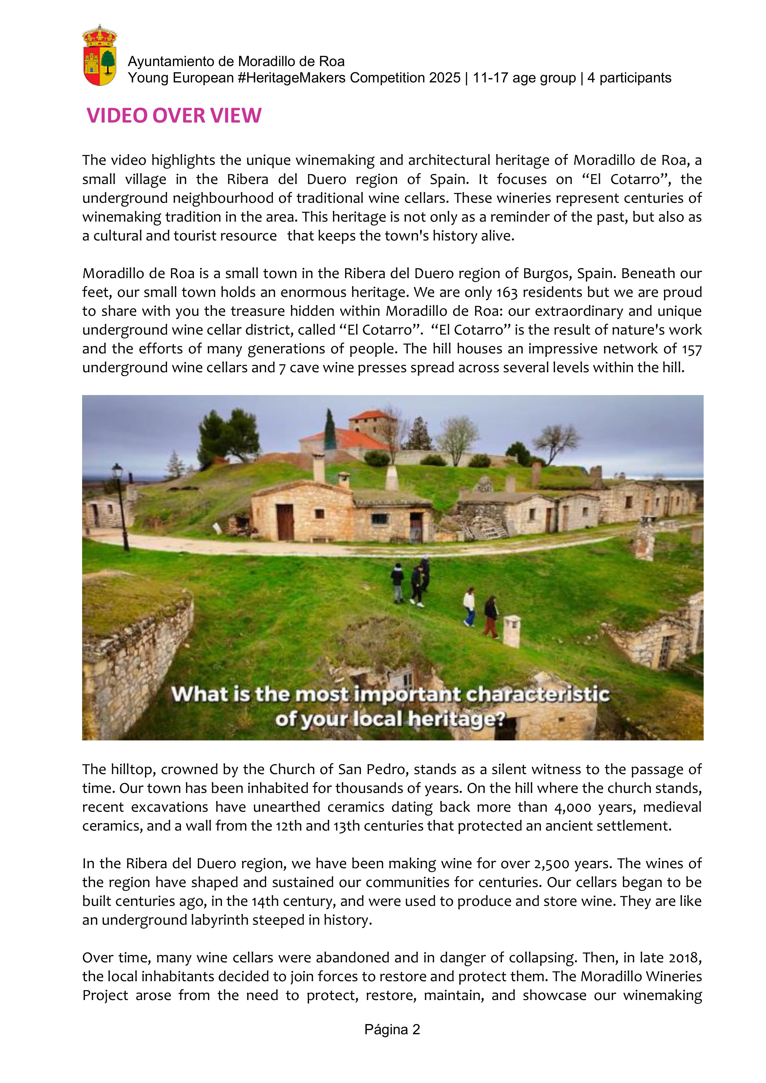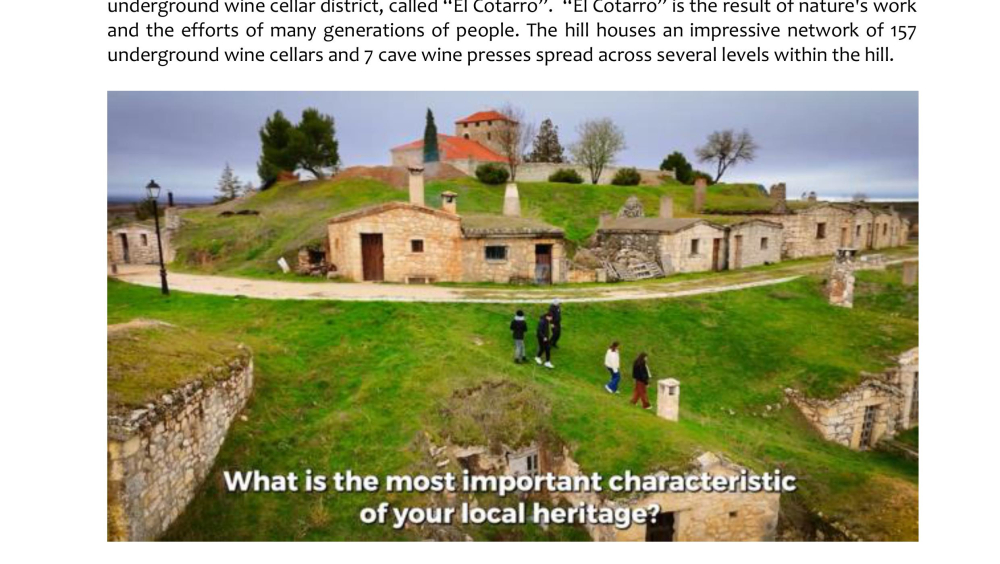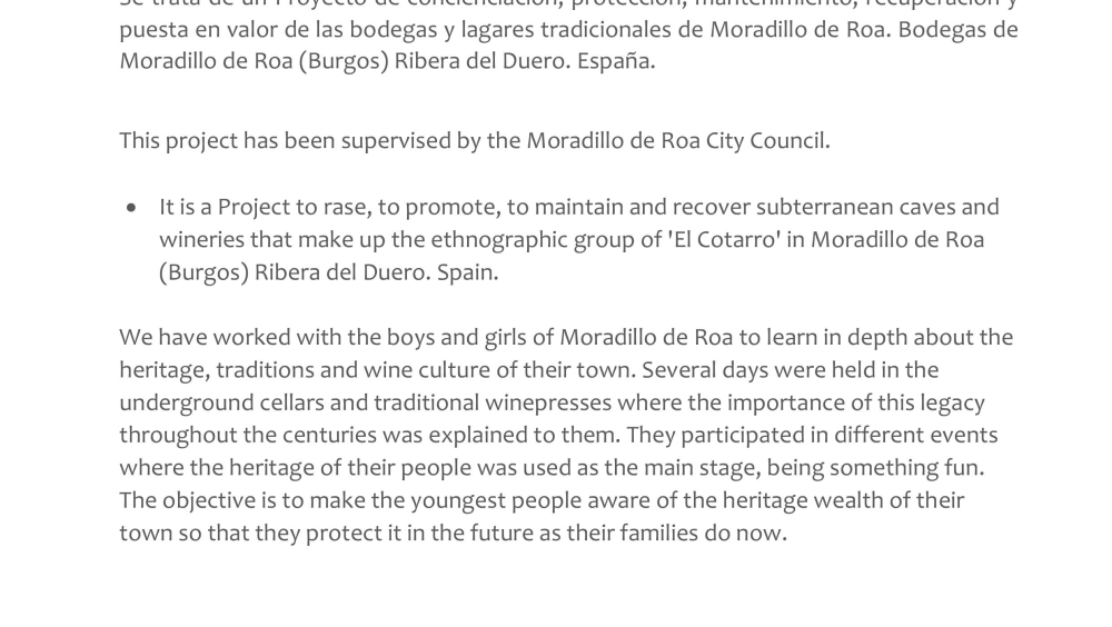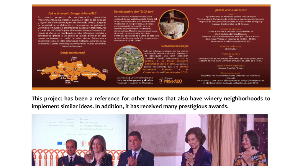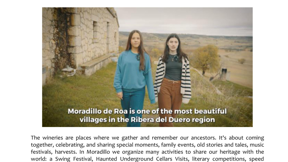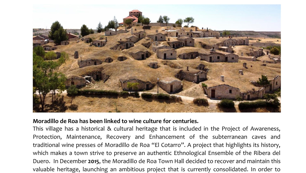 The video highlights the unique winemaking and architectural heritage of Moradillo de Roa, a small village in the Ribera del Duero region of Spain. It focuses on “El Cotarro”, the underground neighbourhood of traditional wine cellars. These wineries represent centuries of winemaking tradition in the area. This heritage is not only as a reminder of the past, but also as a cultural and tourist resource   that keeps the town's history alive.