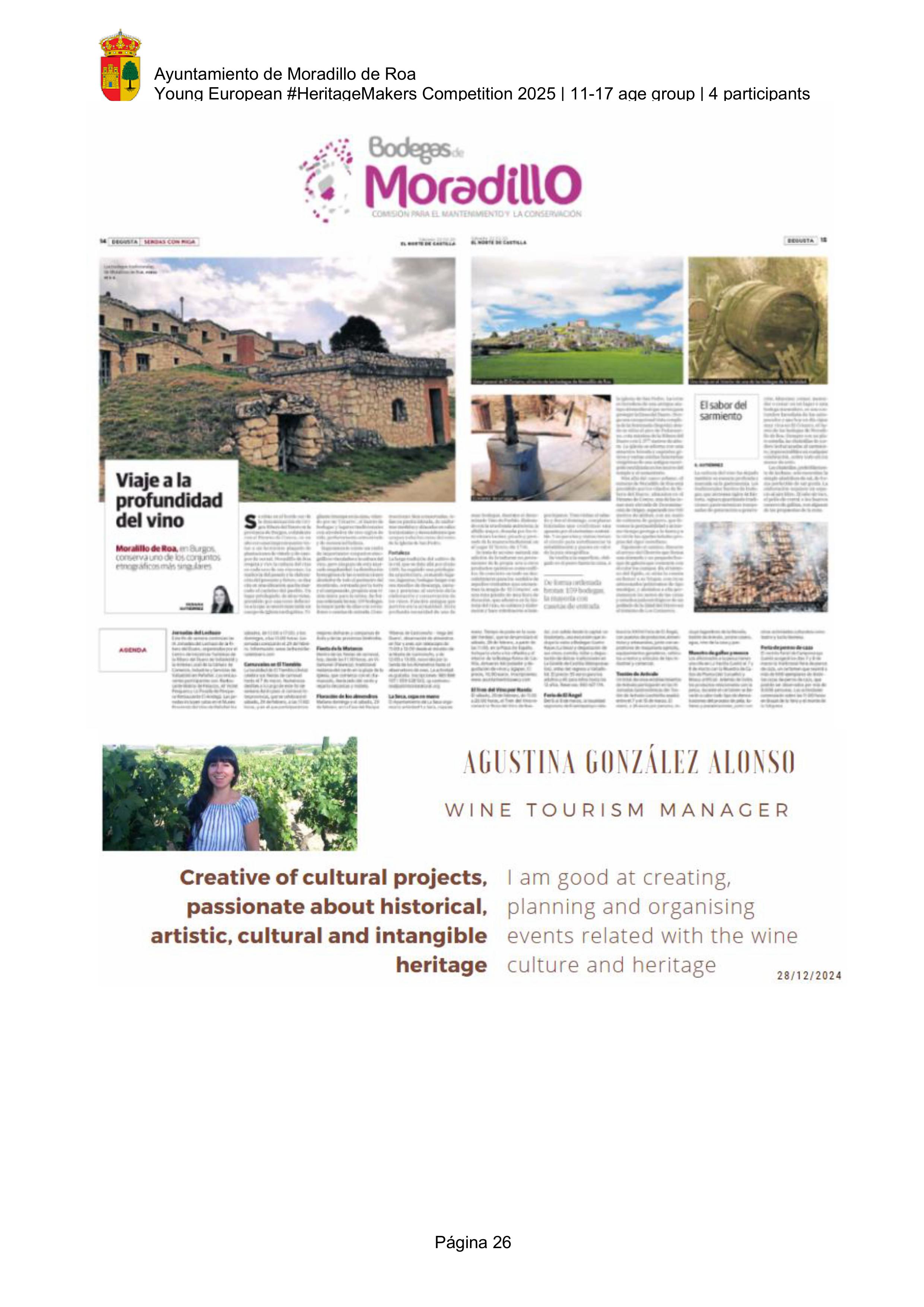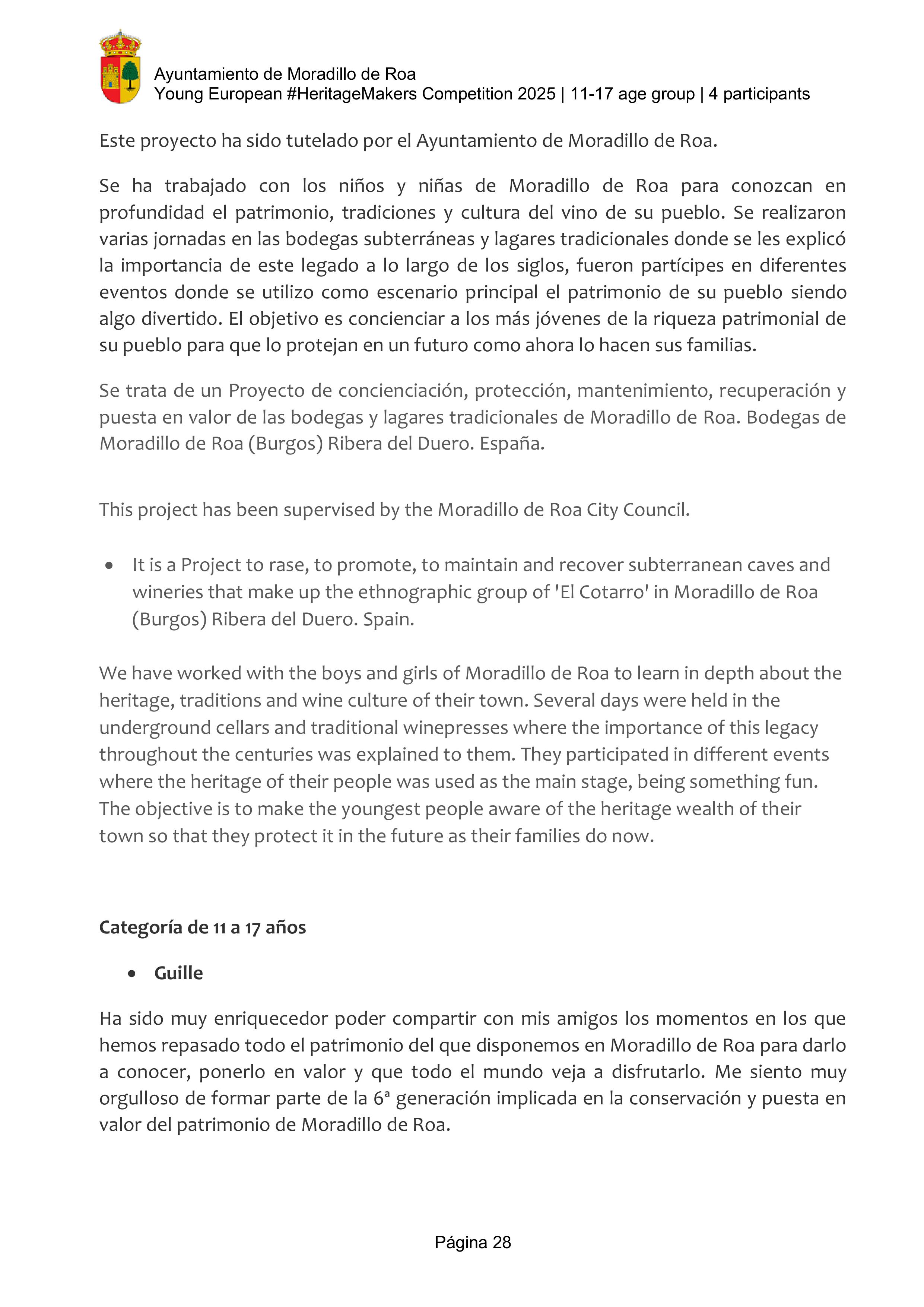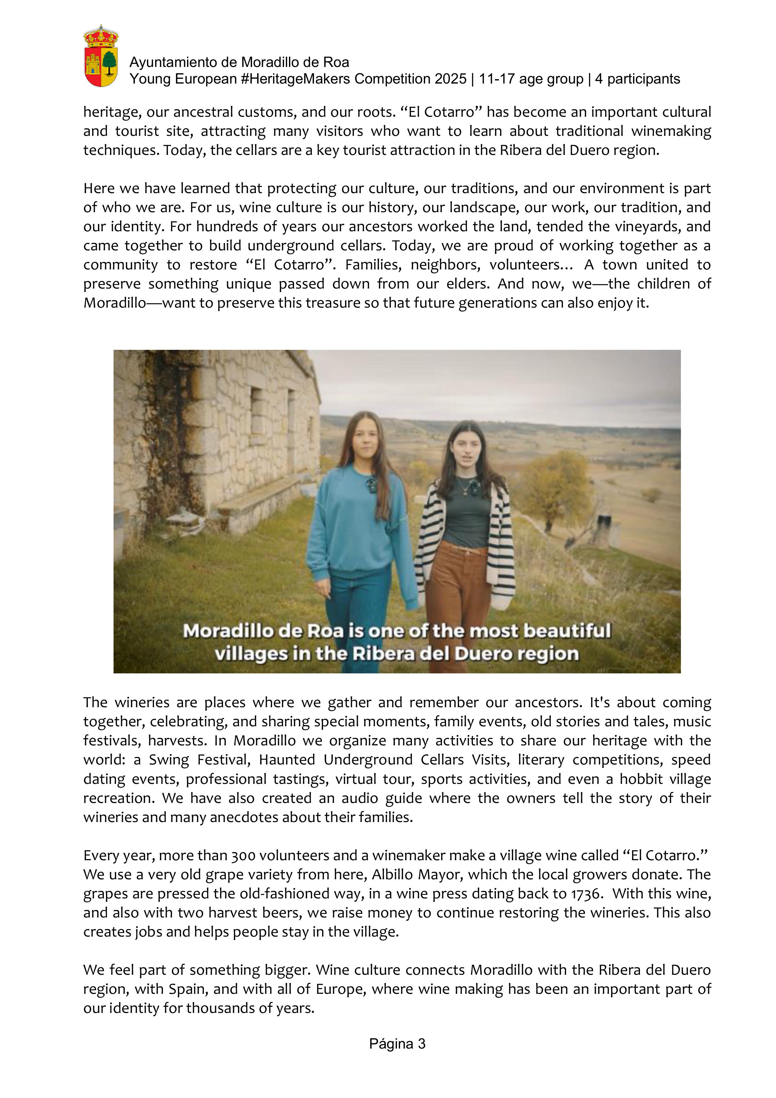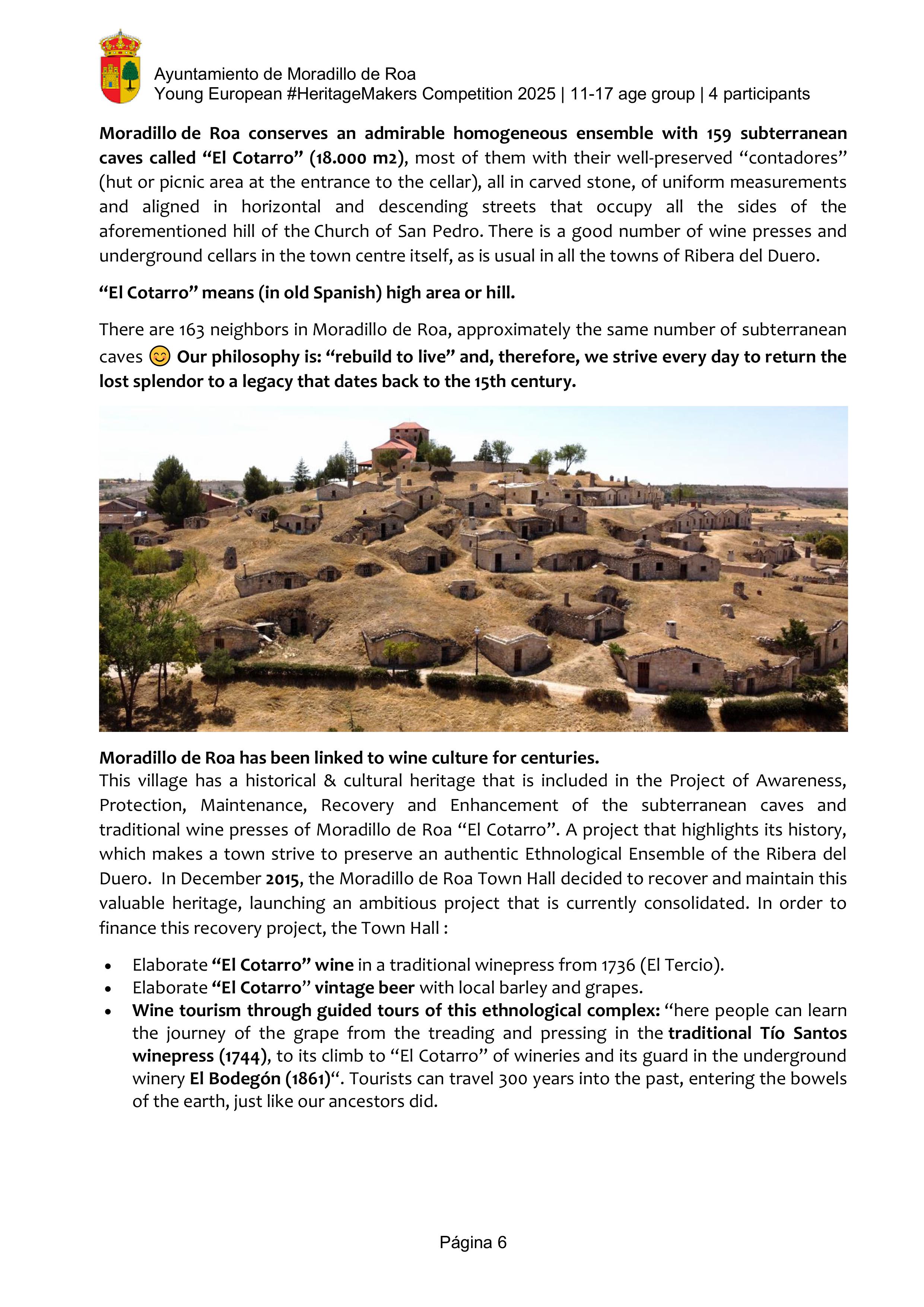 Here we have learned that protecting our culture, our traditions, and our environment is part of who we are. For us, wine culture is our history, our landscape, our work, our tradition, and our identity. For hundreds of years our ancestors worked the land, tended the vineyards, and came together to build underground cellars. Today, we are proud of working together as a community to restore “El Cotarro”. Families, neighbors, volunteers… A town united to preserve something unique passed down from our elders. And now, we—the children of Moradillo—want to preserve this treasure so that future generations can also enjoy it.
