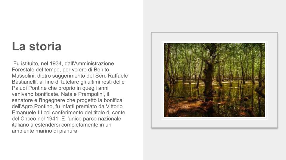 In generale il fine dei musei di scienze naturali, anche locali e di piccole dimensioni come quello del Parco, è di contribuire alla crescita della conoscenza della natura attuale e della sua storia passata, e di contribuire alla divulgazione di questa conoscenza. Il Museo del Parco non si qualifica quindi come museo in senso stretto, mancando di collezioni e di specifici contenuti scientifici e di ricerca ad essi collegati, ma piuttosto come “exhibit” a valenza soprattutto informativa e divulgativa, indirizzato ad accogliere in prima istanza i visitatori del Parco e di indirizzarli sul territorio per le visite e per ulteriori approfondimenti. Fu istituito, nel 1934, dall'Amministrazione Forestale del tempo, per volere di Benito Mussolini, dietro suggerimento del Sen. Raffaele Bastianelli, al fine di tutelare gli ultimi resti delle Paludi Pontine che proprio in quegli anni venivano bonificate. Natale Prampolini, il senatore e l'ingegnere che progettò la bonifica dell'Agro Pontino, fu infatti premiato da Vittorio Emanuele III col conferimento del titolo di conte del Circeo nel 1941. È l'unico parco nazionale italiano a estendersi completamente in un ambiente marino di pianura.Nel Parco Nazionale noi troviamo diversi tipi di uccelli per esempio : La Garzetta, Picchio Muratore, Gheppio , Germano Reale, Cormorano. Poi sono presenti anche diversi tipi di rettili per esempio : la Testuggine comune , -il Ramarro , -il Cervone , -il Biacco , -il Saettone -la Vipera comune . A questi si aggiungono anche gli anfibi come la Raganella , Il Rospo Smeraldino e Il Rospo Comune.Invece i .mammiferi che si possono trovare nel parco sono : il tasso , il riccio , la volpe , la lepre. Per quanto riguarda le piante, all’interno del parco abbiamo: Cerri ( Quercus cerris ) Farnetto ( Quercus frainetto ) Farnia ( Quercus robur ) Roverella ( Quercus pubescens ) Sughera ( Quercus suber ) Leccio ( Quercus ilex ) . Il sughero, la quercia da sughero , o sughera , è un albero sempreverde della famiglia delle Fagacee . Originaria dell'Europa sud - occidentale e dell'Africa nord - occidentale è da tempi remoti naturalizzata e spontanea in tutto il bacino occidentale del mar Mediterraneo , molto longeva e può diventare plurisecolare .