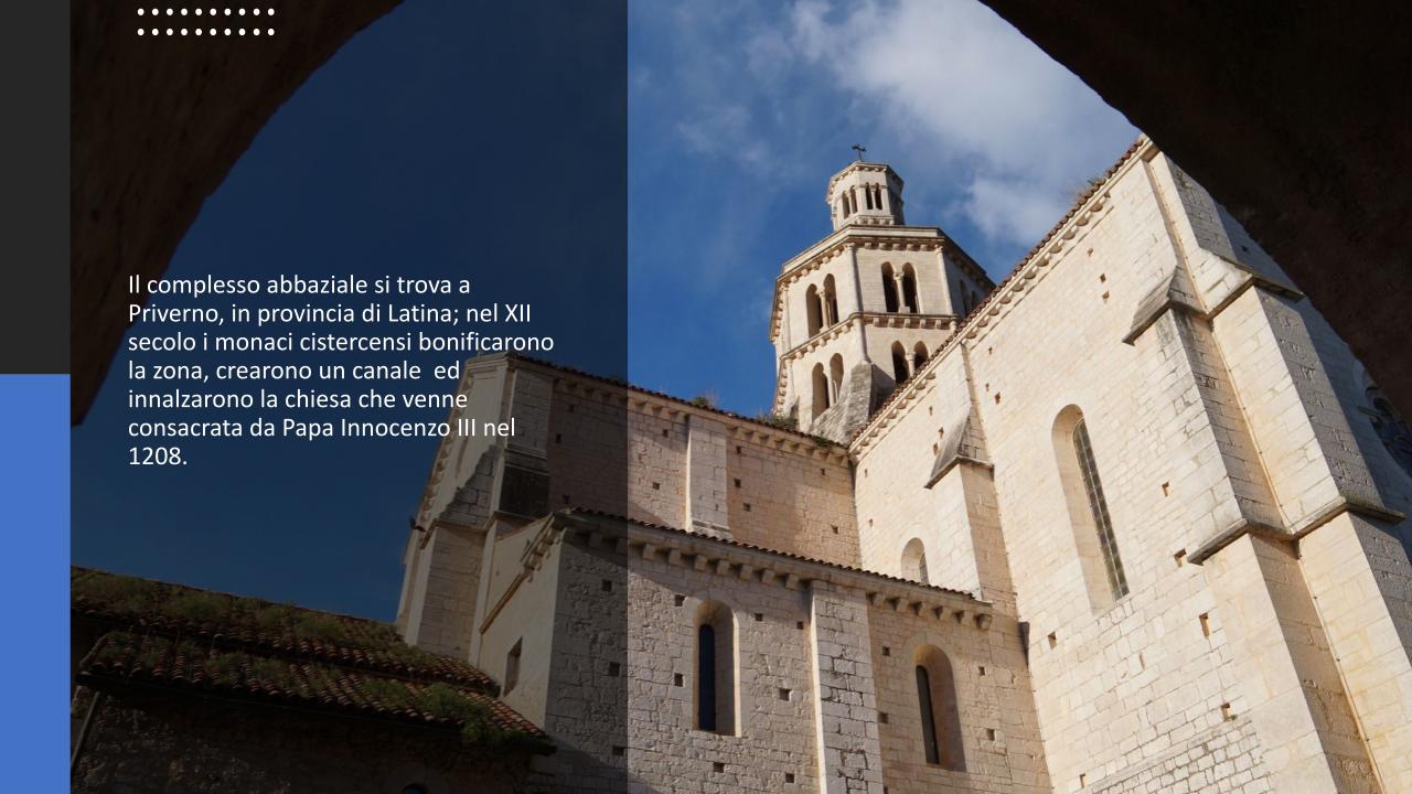 L'Abbazia di Fossanova è situata nel comune di Priverno (LT), rappresenta un esempio di transizione dal romanico al gotico, la costruzione durò dal 1163 al 1208. Fu inizialmente monastero benedettino e successivamente, per volere di Innocenzo II , fu concessa ai cistercensi che la edificarono nelle forme attuali. Il nucleo principale è costituito dalla Chiesa con il Chiostro su cui ruotano il Refettorio, la Sala Capitolare, l'Infermeria dei monaci e la Casa dell'Abate, dove morì San Tommaso d'Aquino nel 1274.