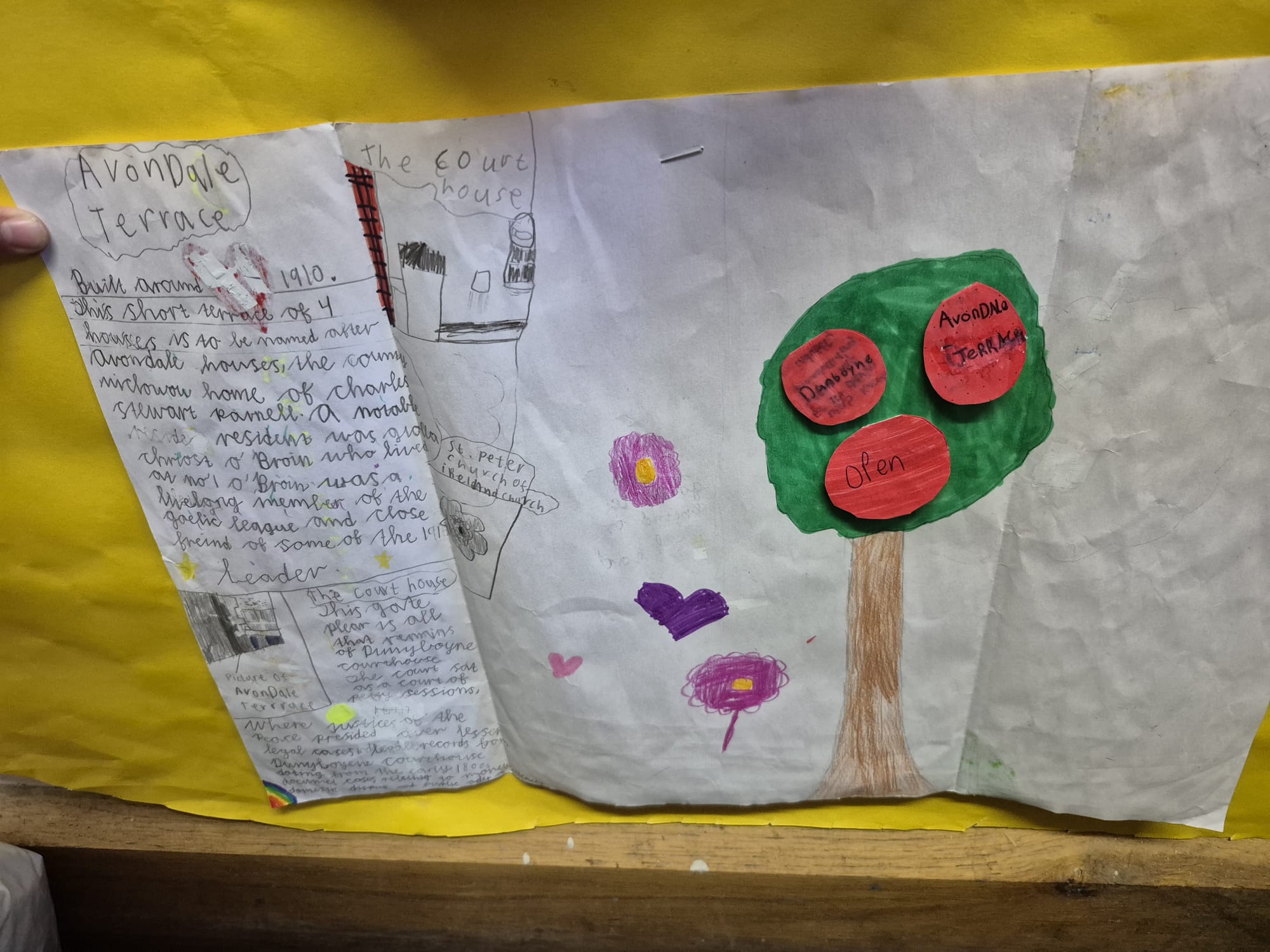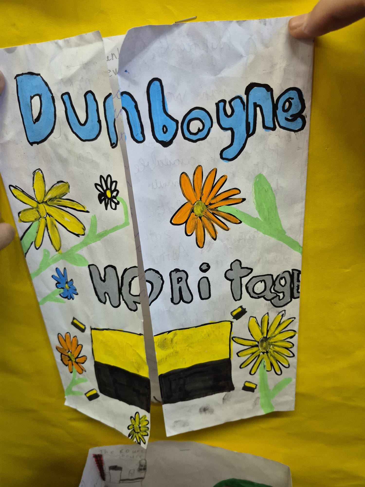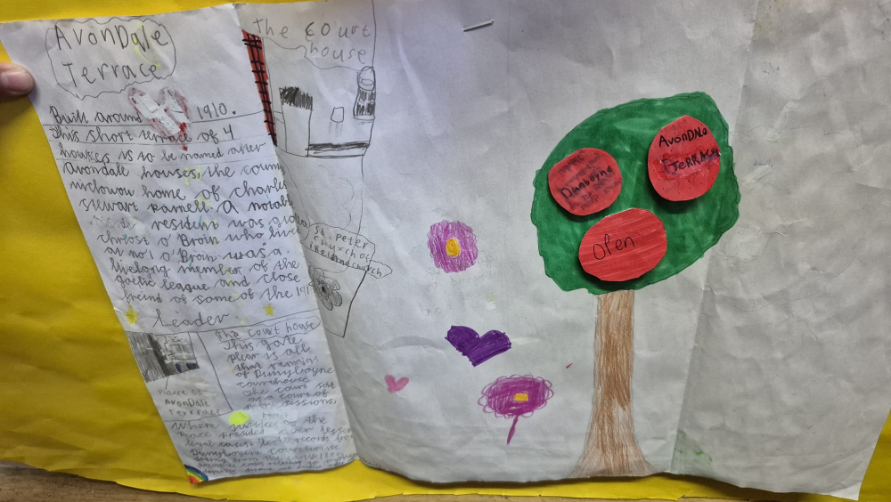 The trunk represents strength and responsibility. It reminds us that we must look after Dunboyne — its nature, buildings, and community — because heritage only survives when people care for it. Our recent achievement of winning the National Schools Award at the Tidy Towns competition shows that we are already living up to this responsibility and playing our part in looking after our village. The old Irish proverb “Ar scáth a chéile a mhaireann na daoine,” which means we live in each other’s shadow, inspired us. It shows that community matters and that we depend on one another to make our home a good place to live.