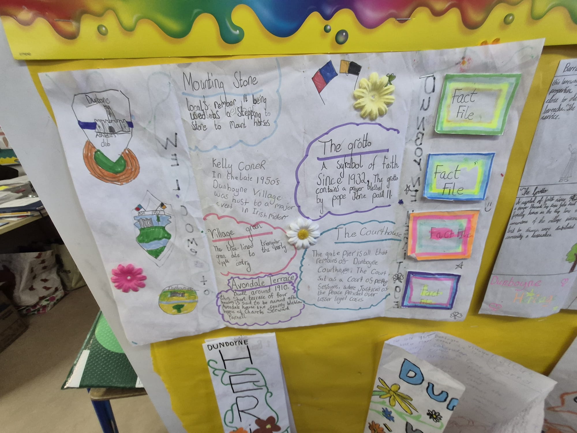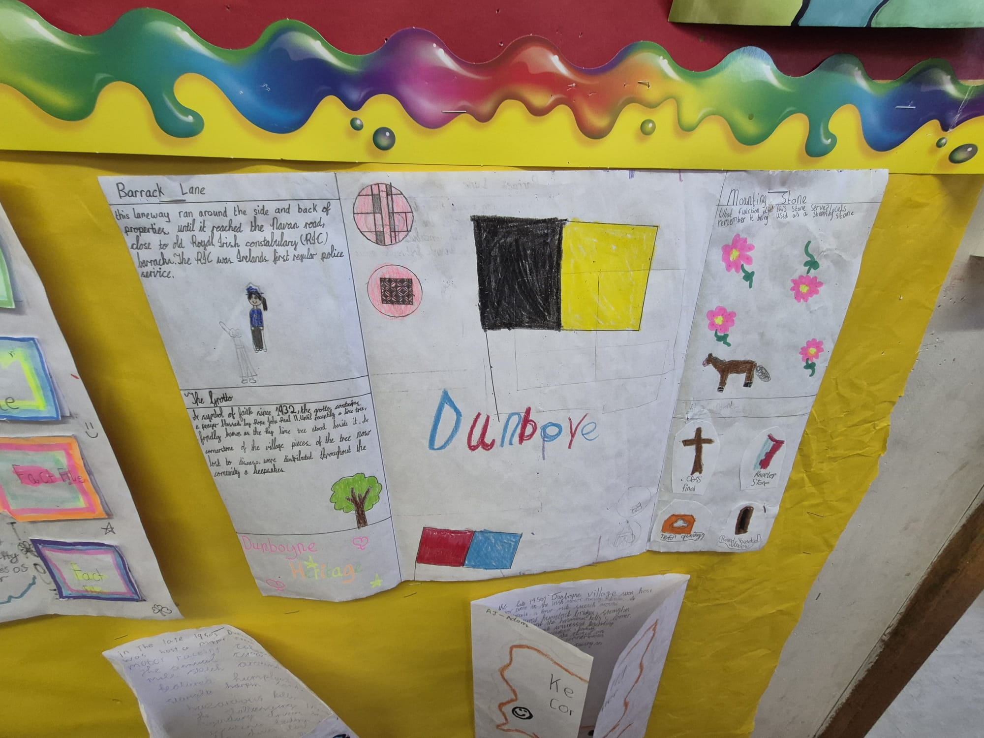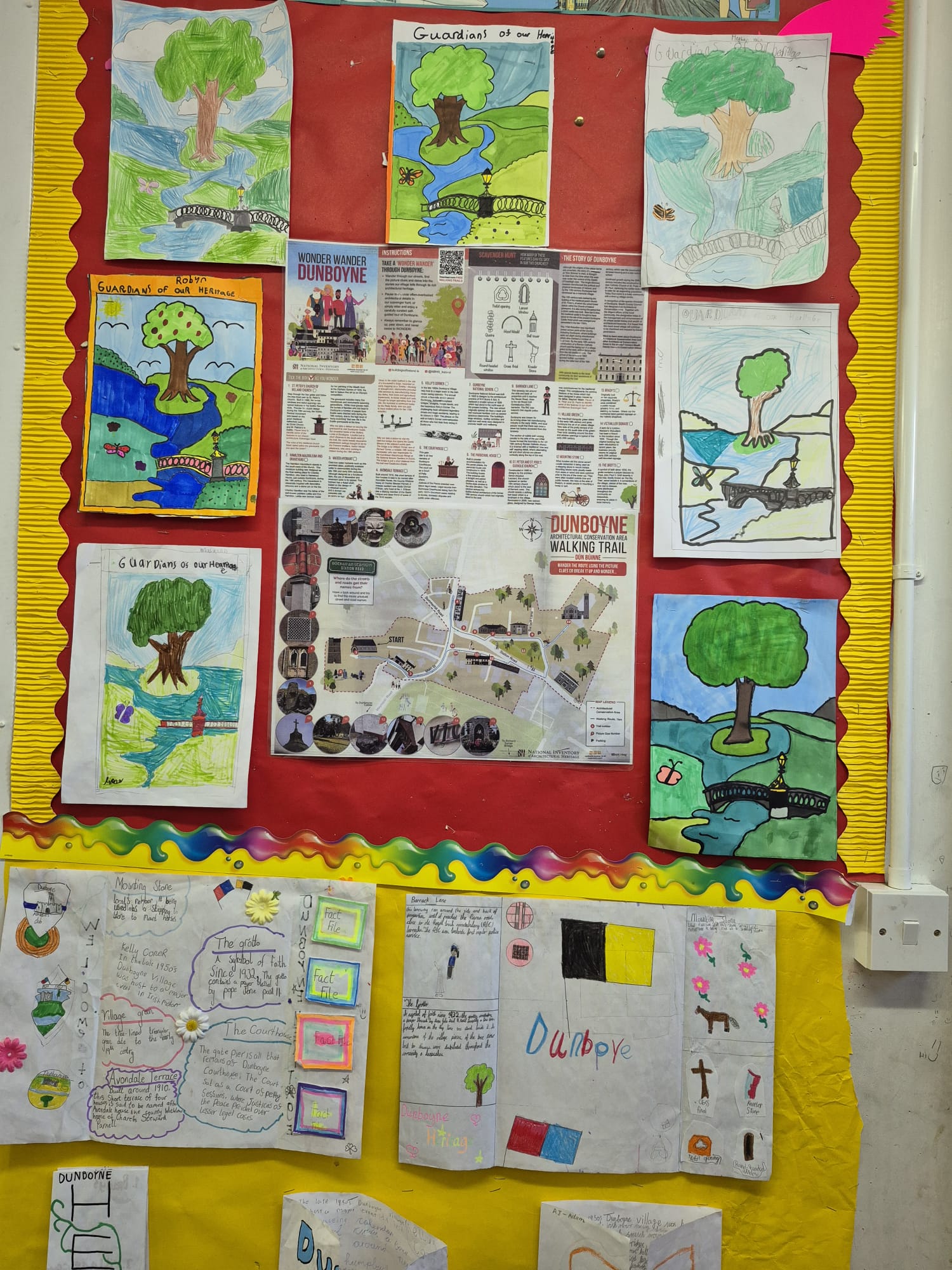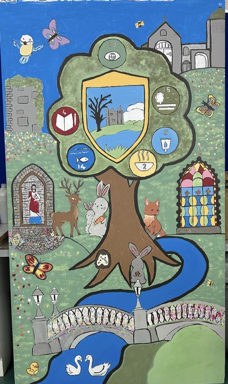 The inspiration for our mural came from the Wonder Wander Walking Trail, a special trail created for Dunboyne by the National Inventory of Architectural Heritage and Meath County Council. We explored parts of this trail as a class, and we were amazed to discover how many incredible sites and stories are right beside us. Even places we walk past every day have hidden meanings and history behind them. Exploring the trail helped us understand how heritage is all around us — sometimes you just have to slow down and look.