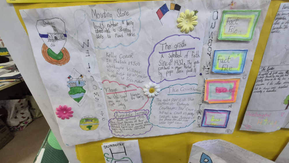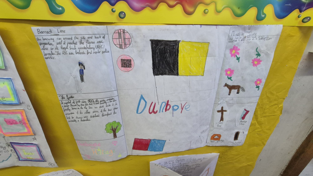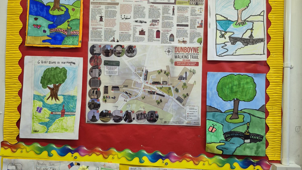 Our heritage mural is a celebration of Dunboyne — its people, its stories, its places, its nature, and its future. When we started this project, we wanted to understand what heritage really means. We learned that heritage is not only about old buildings or events from the past. It is also about our environment, our families, our community, and the things we want to protect for the future. As part of this learning, we take part in the Heritage in Schools Programme, Green Schools Programme, GLOBE Programme, Biodiversity in Schools Nature Hero Awards and the Irish Aid Programme, as well as G.I.Y Grow Your Own, Incredible Edibles, Rivers as Ecosystems, and the Trinity College CAD Lichen Mural Project. We also held an Action Day in our local GAA Club where we planted over 500 spring bulbs. All of these projects show our ongoing commitment to protecting, understanding, and celebrating the natural heritage around us. Our mural is a way for us to show what Dunboyne means to us and how we want it to be for the generations that will come after us.