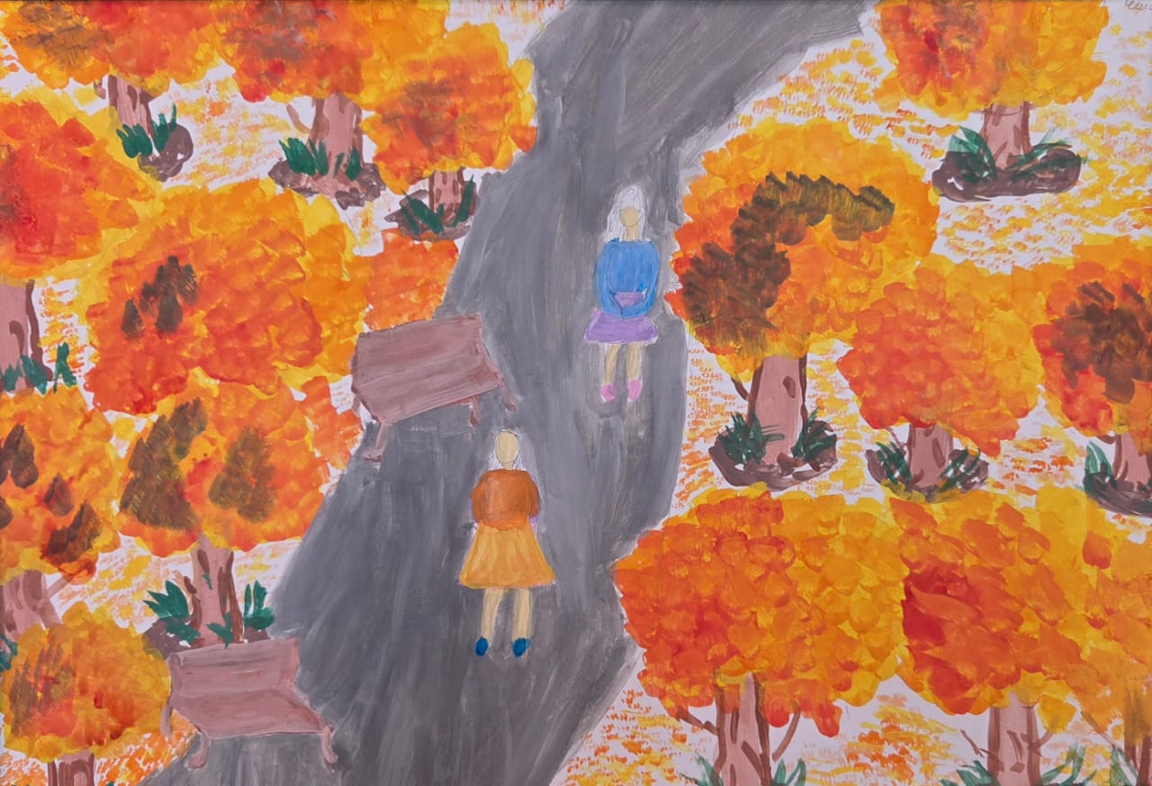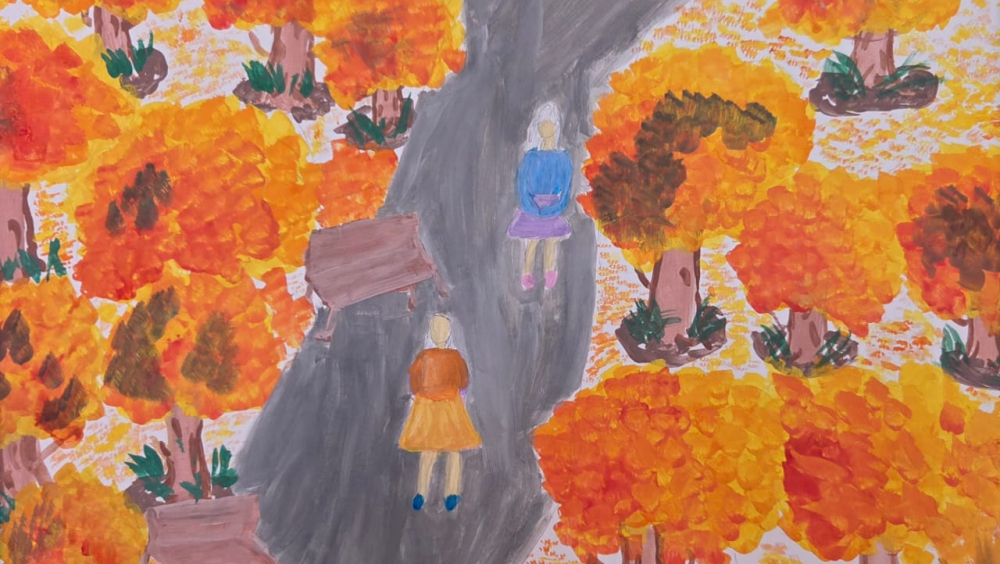 In one artwork, we drew autumn trees. This shows how a child might imagine things being passed from one generation to another. For us, the trees are like life itself. They represent people planting nature so that future generations can enjoy it too.