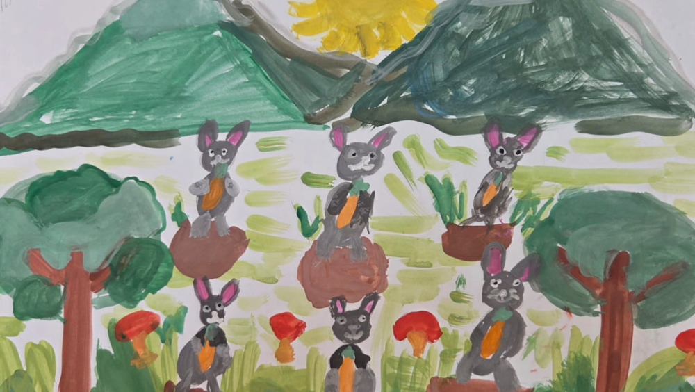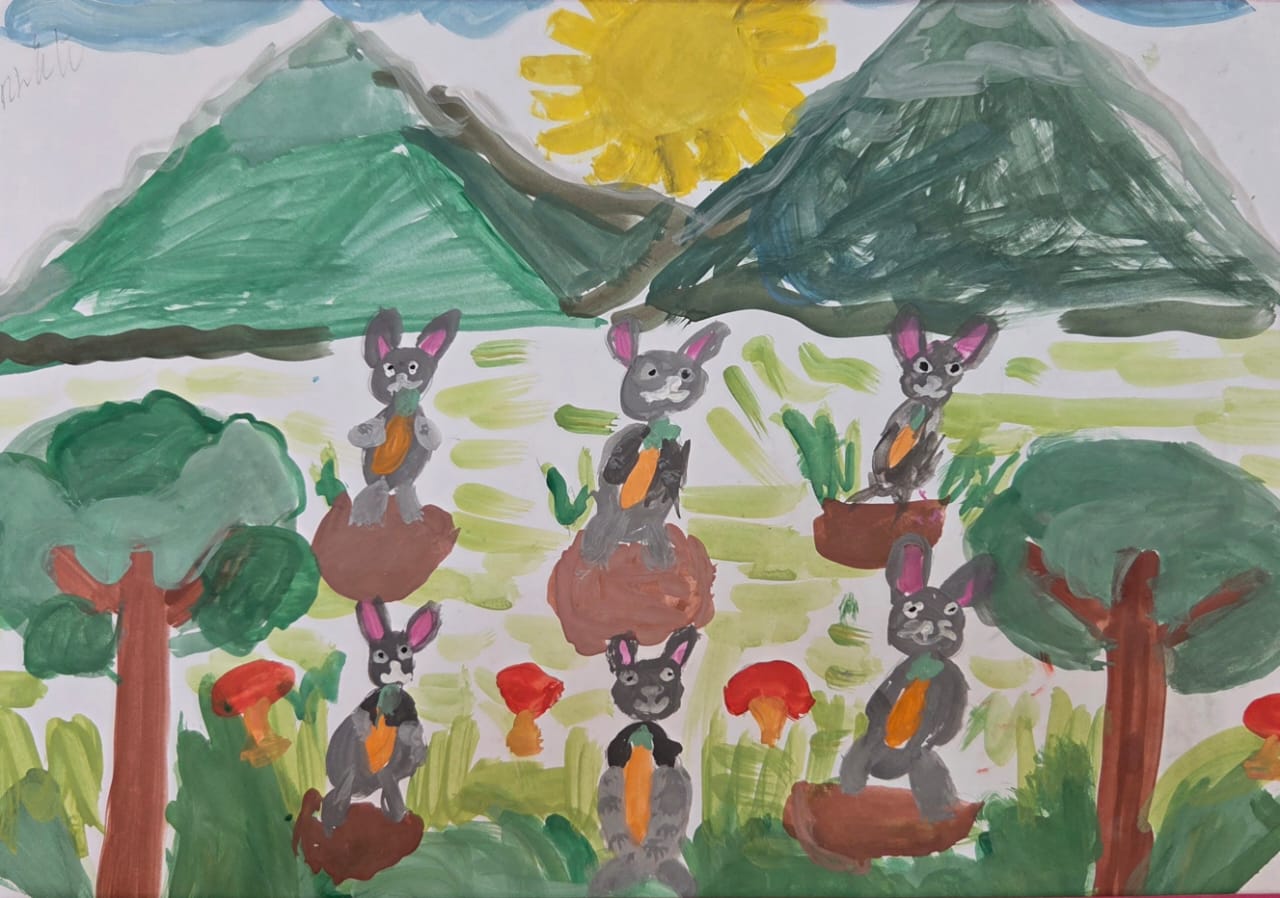 In another drawing, there is an open field with rabbits and carrots. We thought of the field as a place where everyone can find food. Because it keeps giving food, there will always be enough for everyone.
